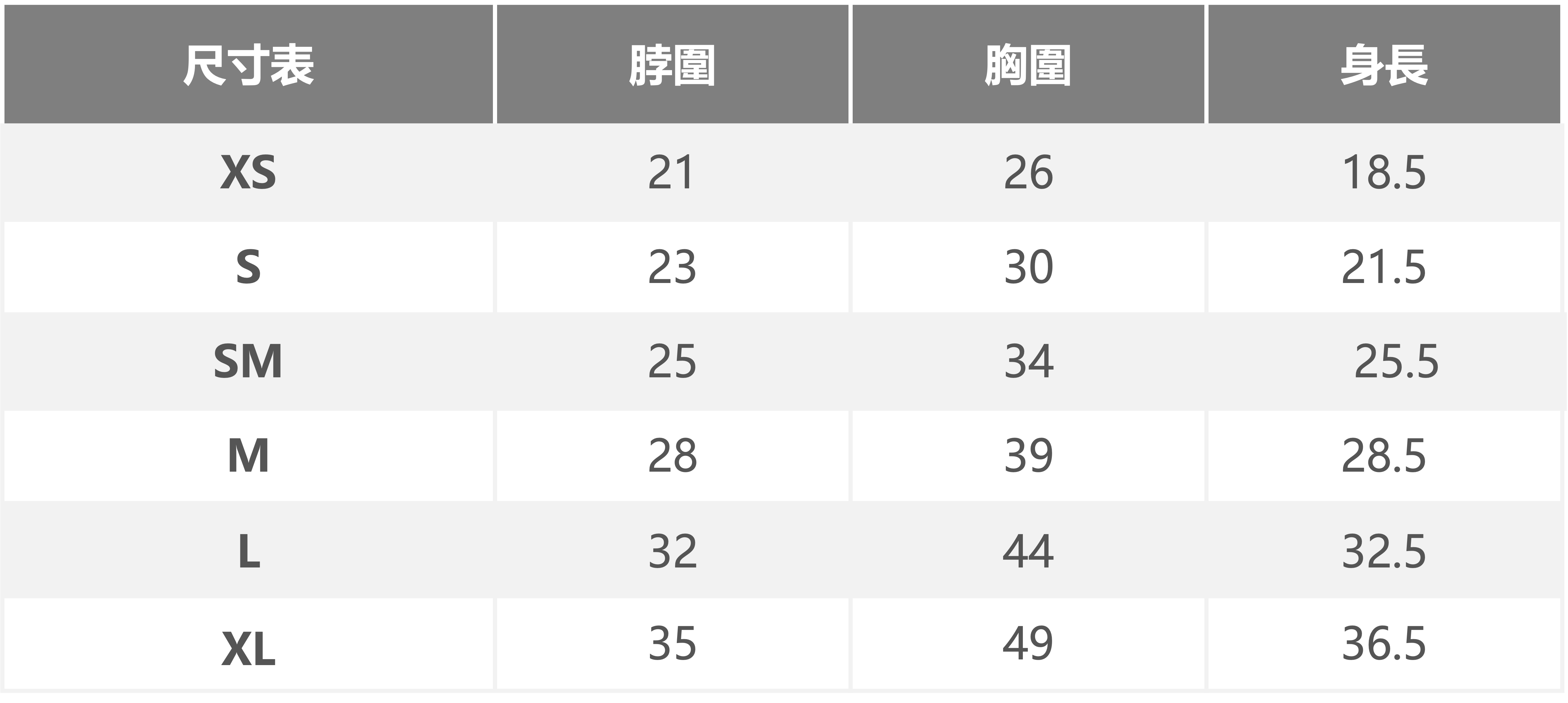 2. 尺寸選擇請以胸圍為主,衣長穿著起來的長度會因版型與狗狗身材而有不同。
