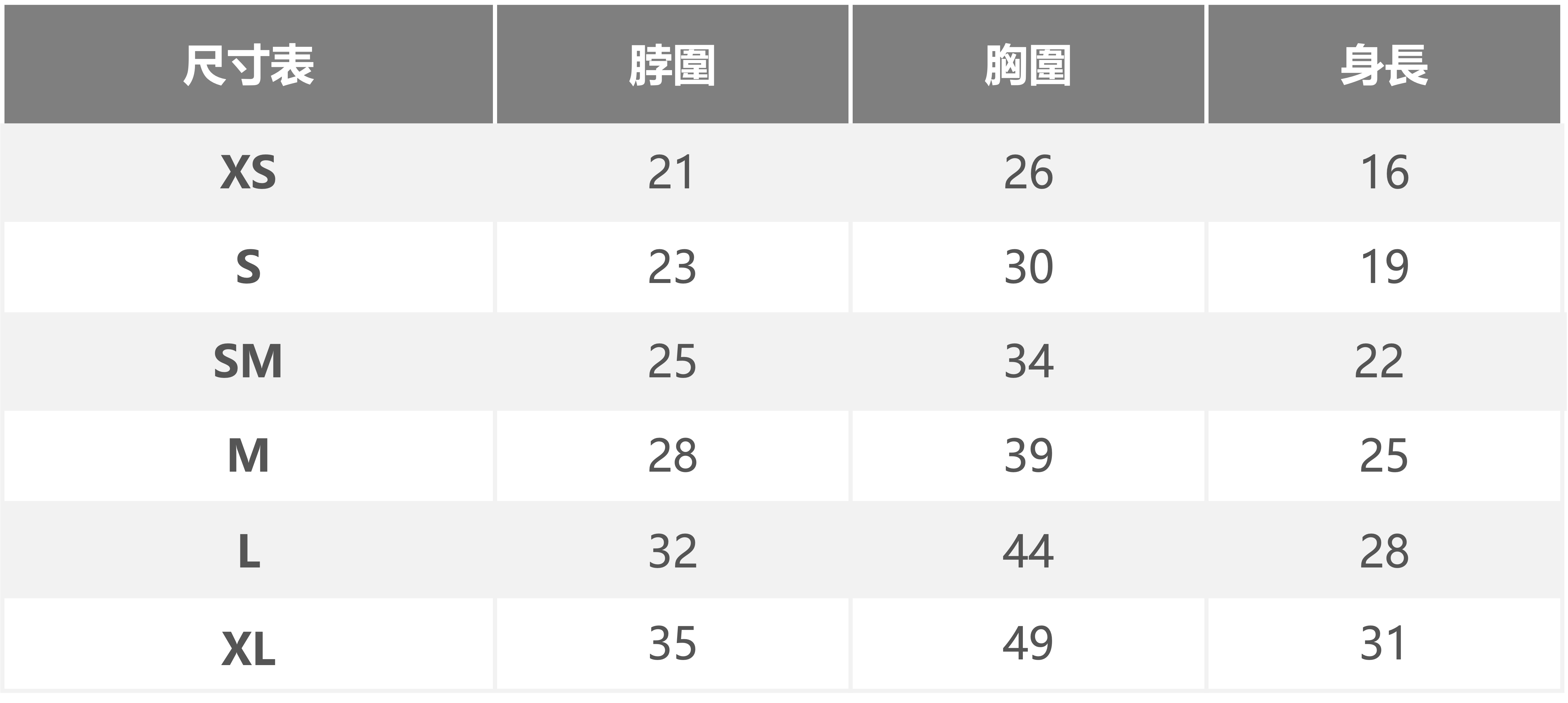 2. 尺寸選擇請以胸圍為主,衣長穿著起來的長度會因版型與狗狗身材而有不同。