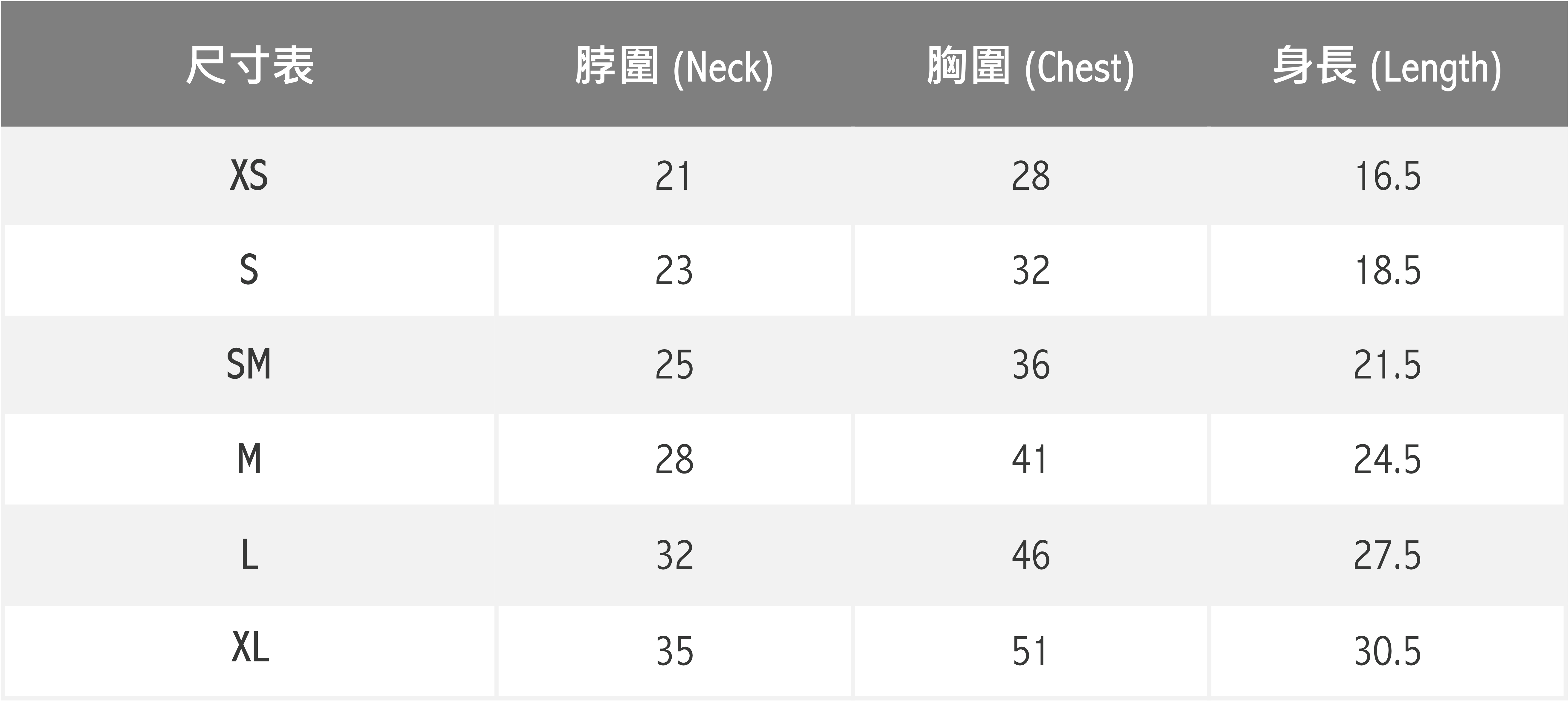 2. 尺寸選擇請以胸圍為主,衣長穿著起來的長度會因版型與狗狗身材而有不同。