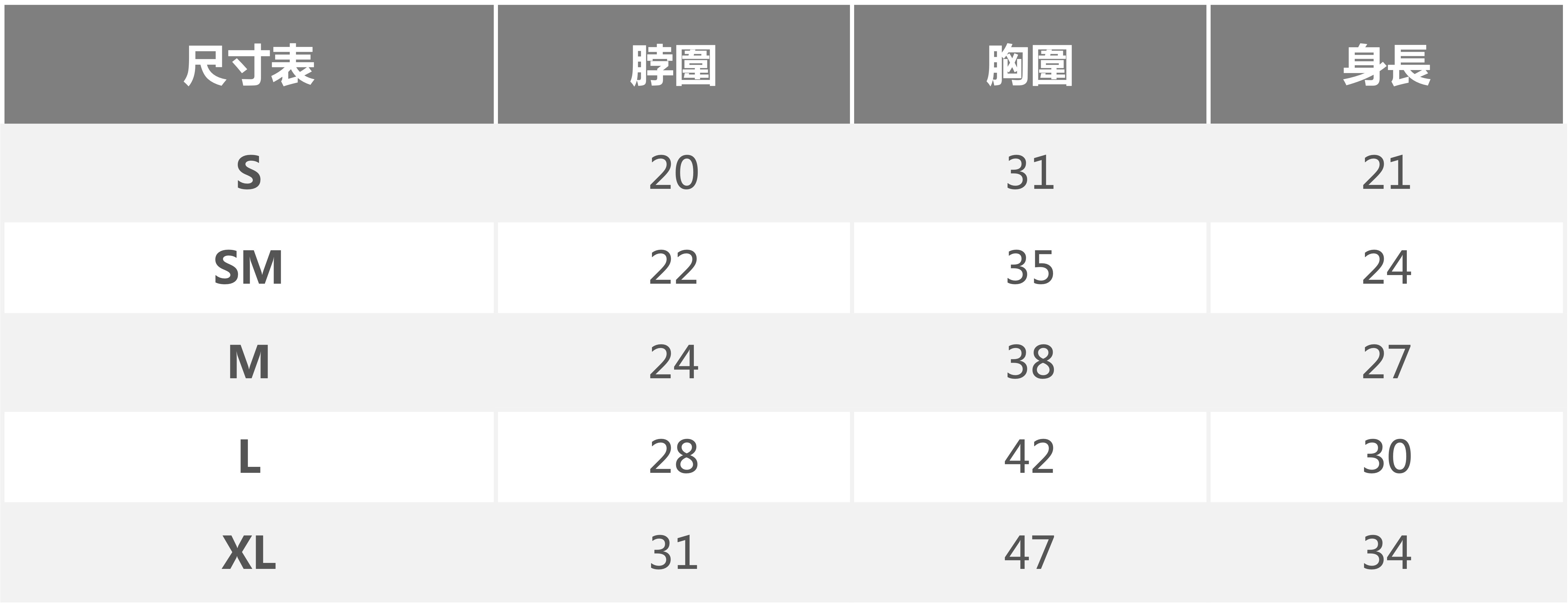 * 尺寸選擇請以胸圍為主,衣長穿著起來的長度會因版型與狗狗身材而有不同。