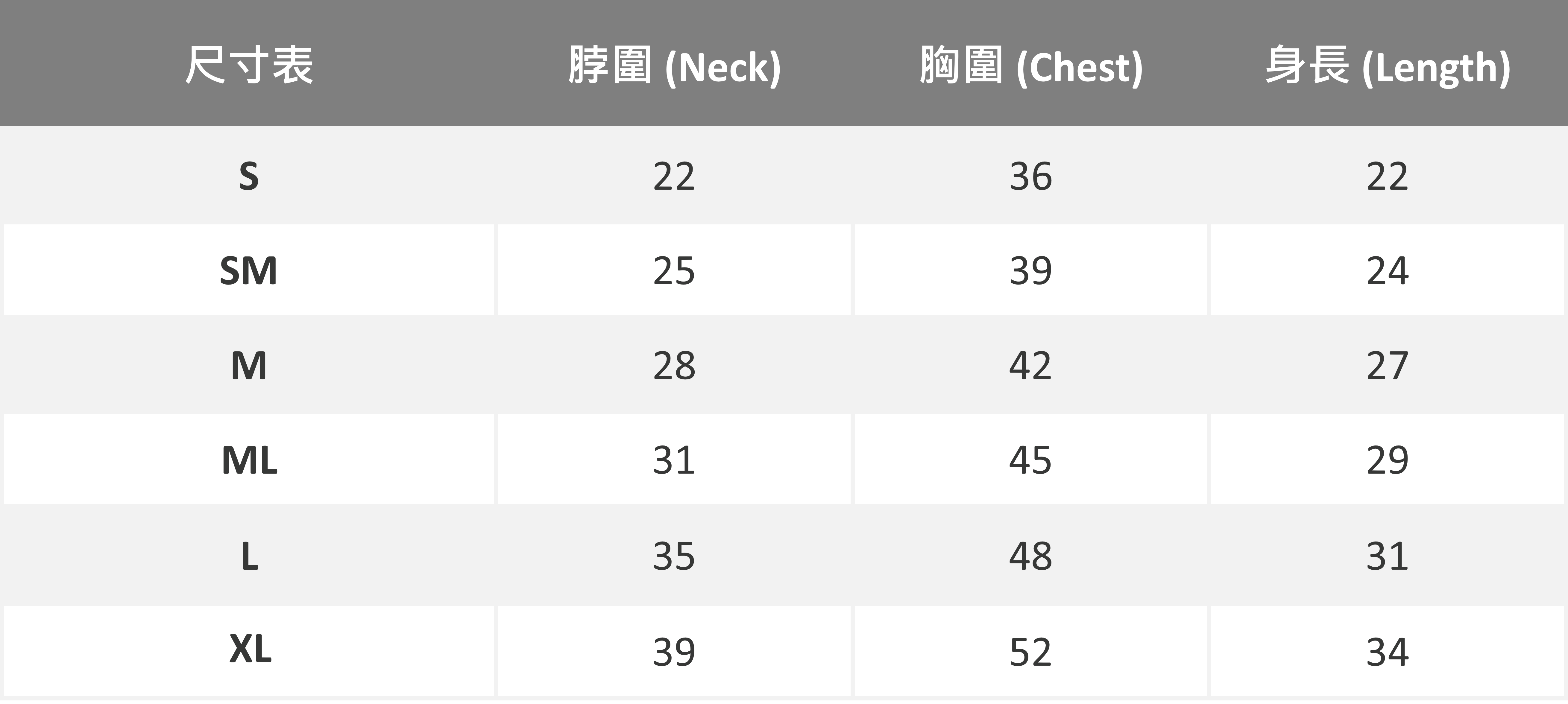 2. 尺寸選擇請以胸圍為主,衣長穿著起來的長度會因版型與狗狗身材而有不同。