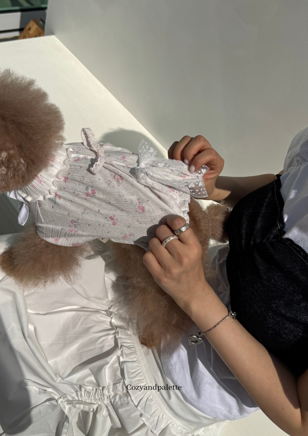上衣為輕盈寬鬆剪裁,適合日常穿搭或疊搭造型,下擺微鬆、活動不卡,推薦搭配同系列迷你裙或輕薄褲裝,打造屬於毛孩的城市甜感穿搭。
