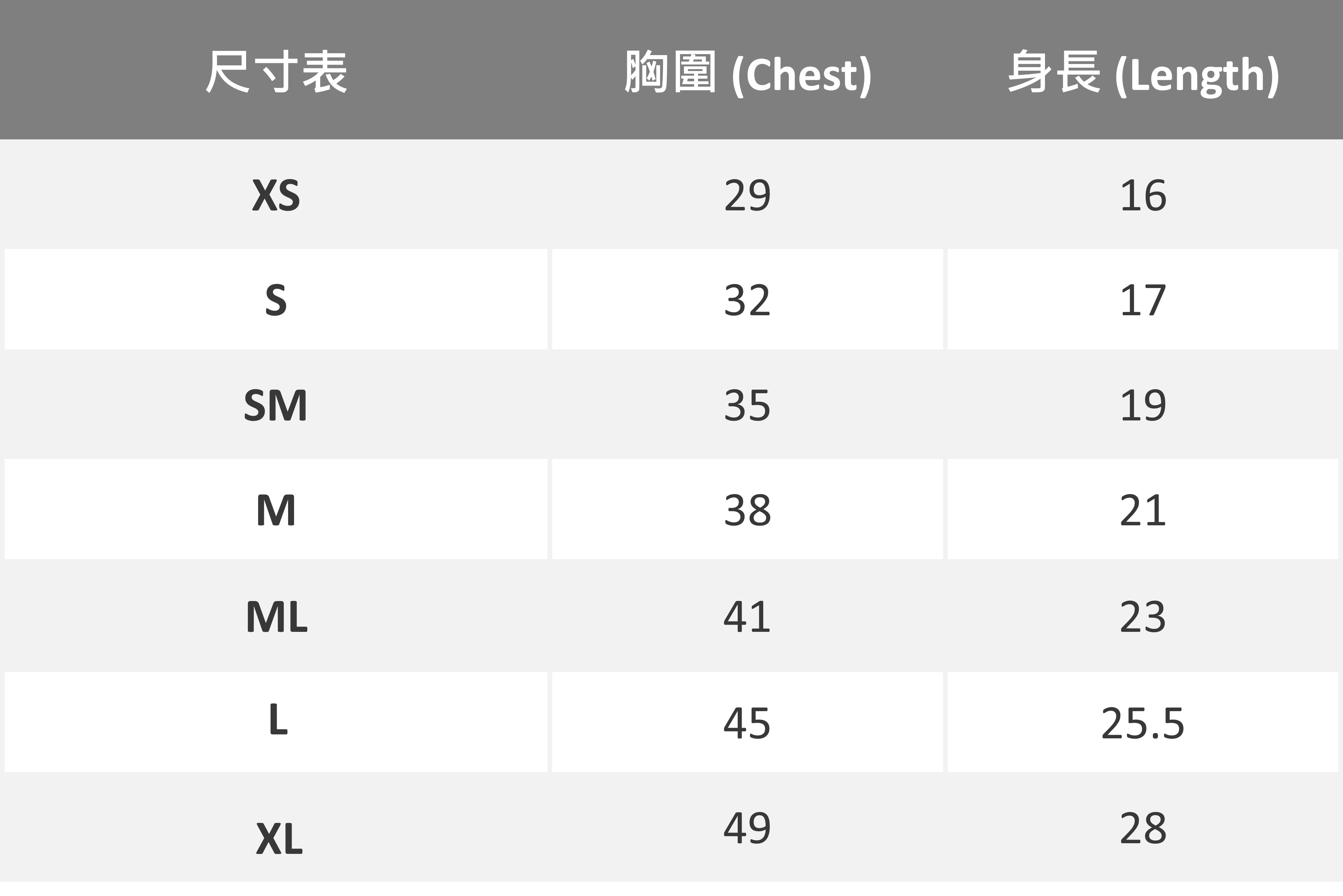 尺寸表