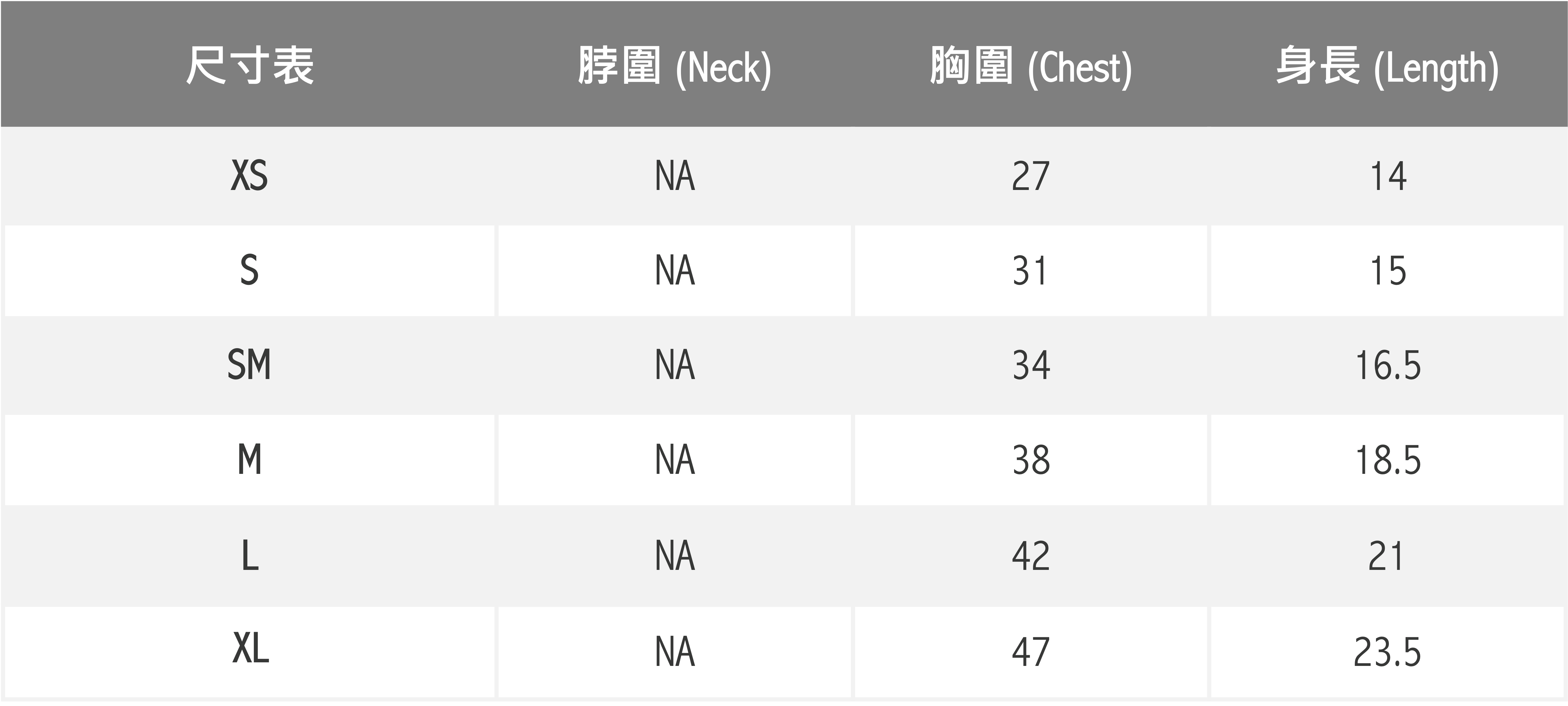 2. 尺寸選擇請以胸圍為主,衣長穿著起來的長度會因版型與狗狗身材而有不同。