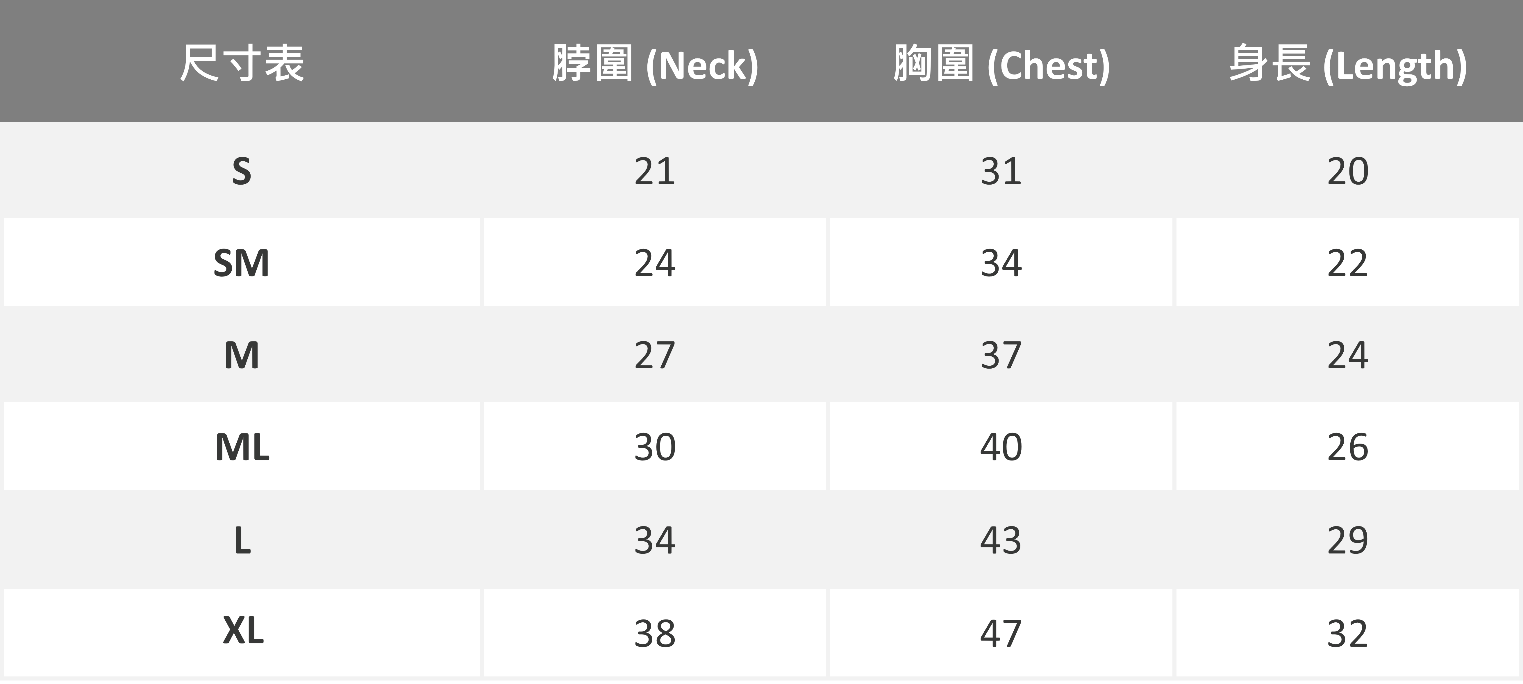2. 尺寸選擇請以胸圍為主,衣長穿著起來的長度會因版型與狗狗身材而有不同。