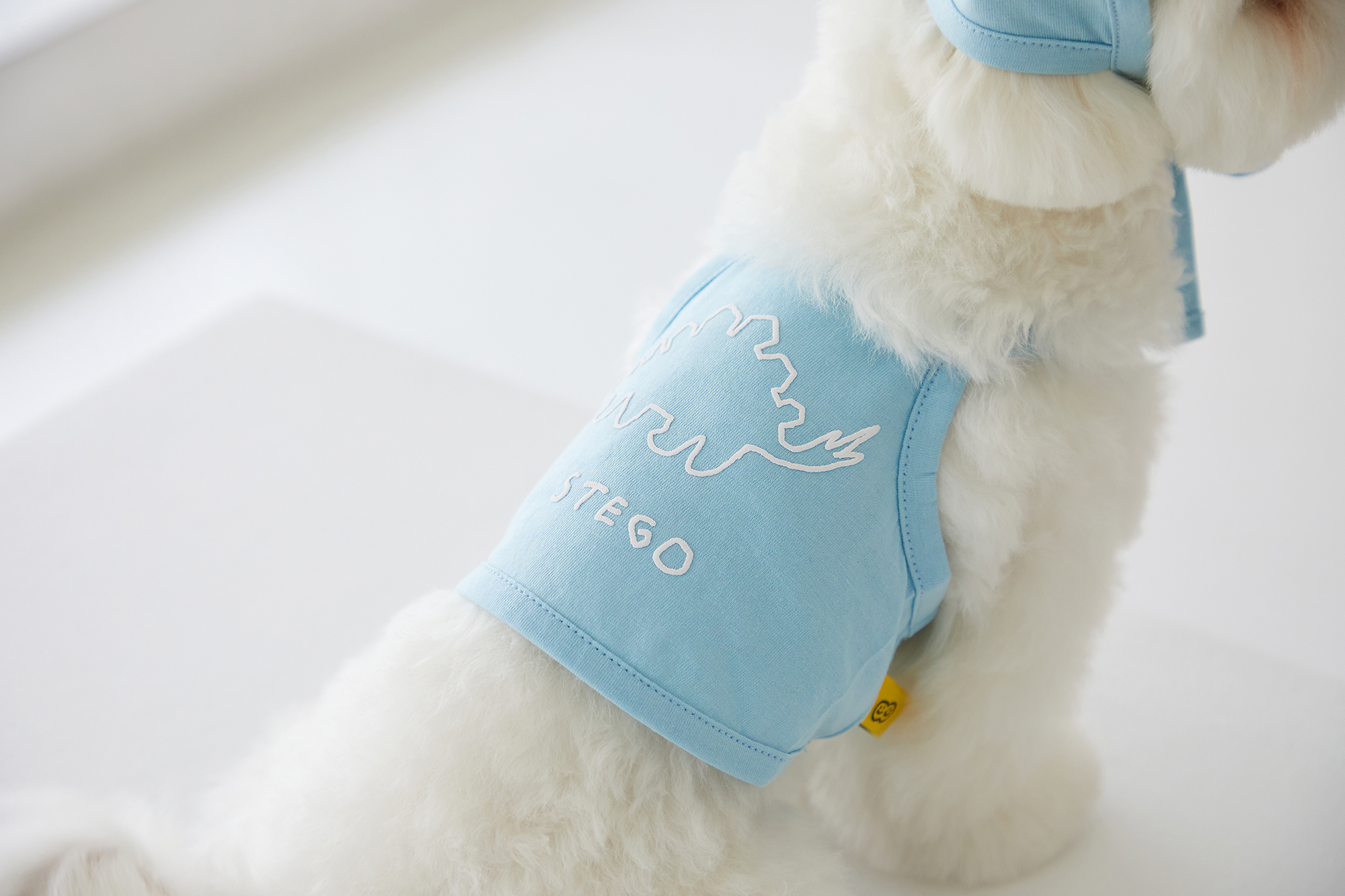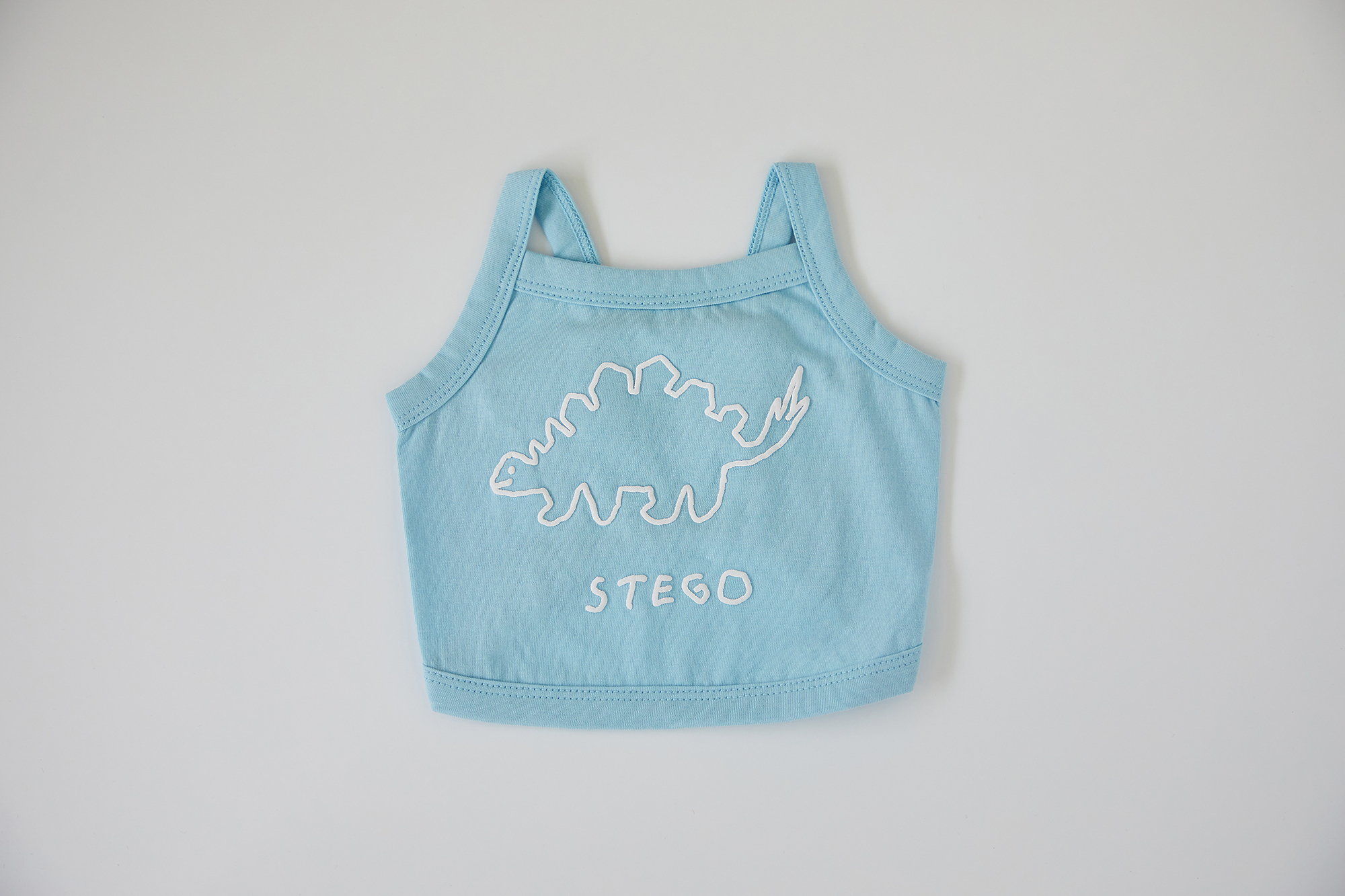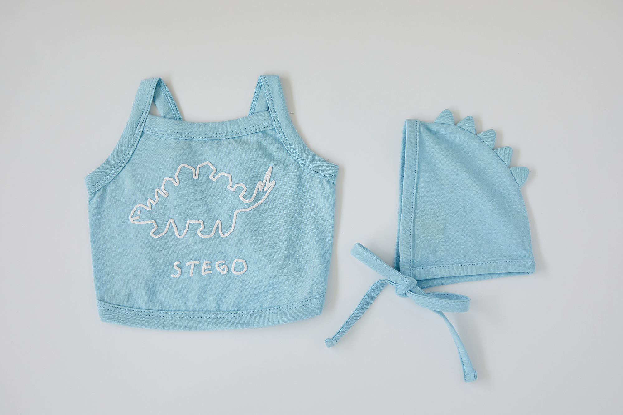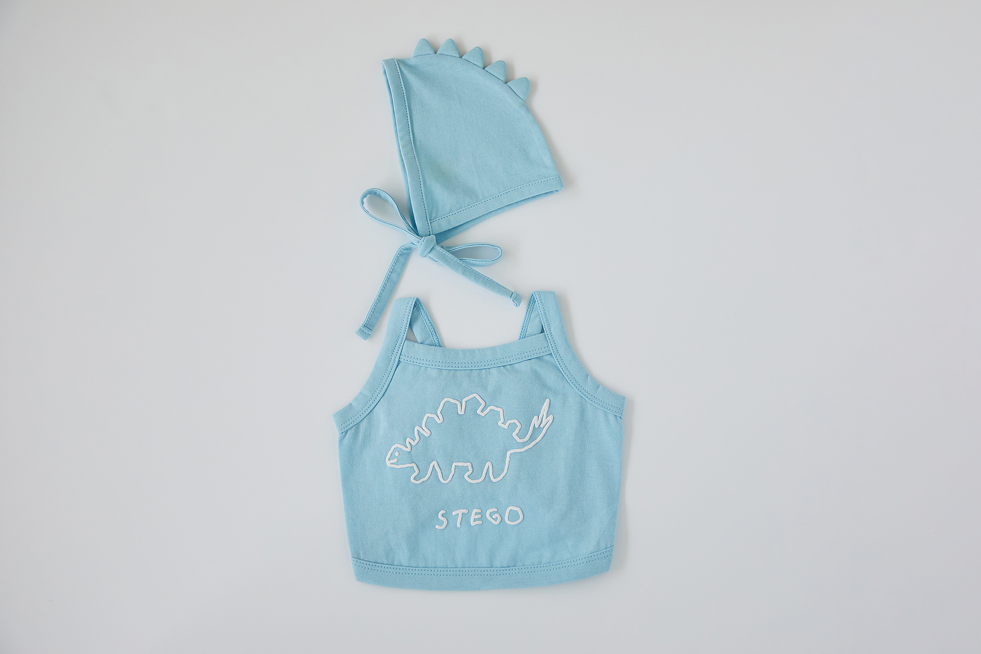 短版的細肩帶背心與小童帽組,清新配色與呆萌恐龍,