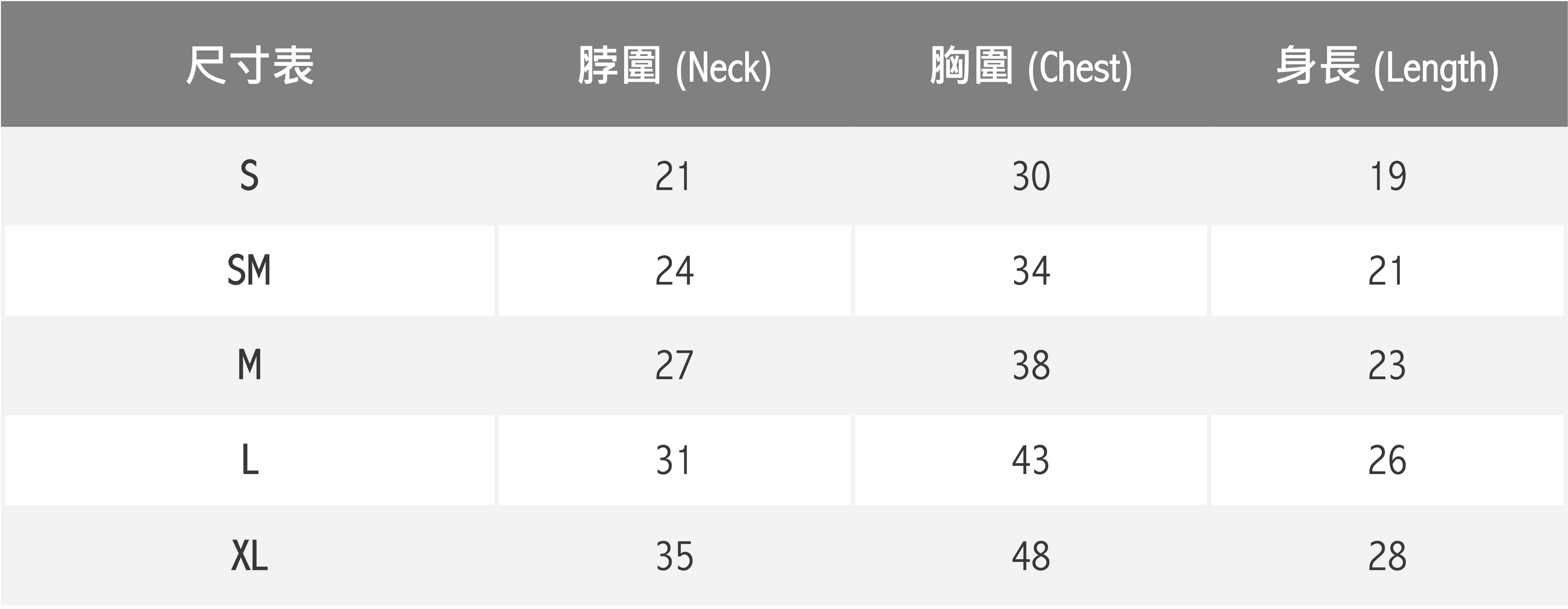 2. 尺寸選擇請以胸圍為主,衣長穿著起來的長度會因版型與狗狗身材而有不同。