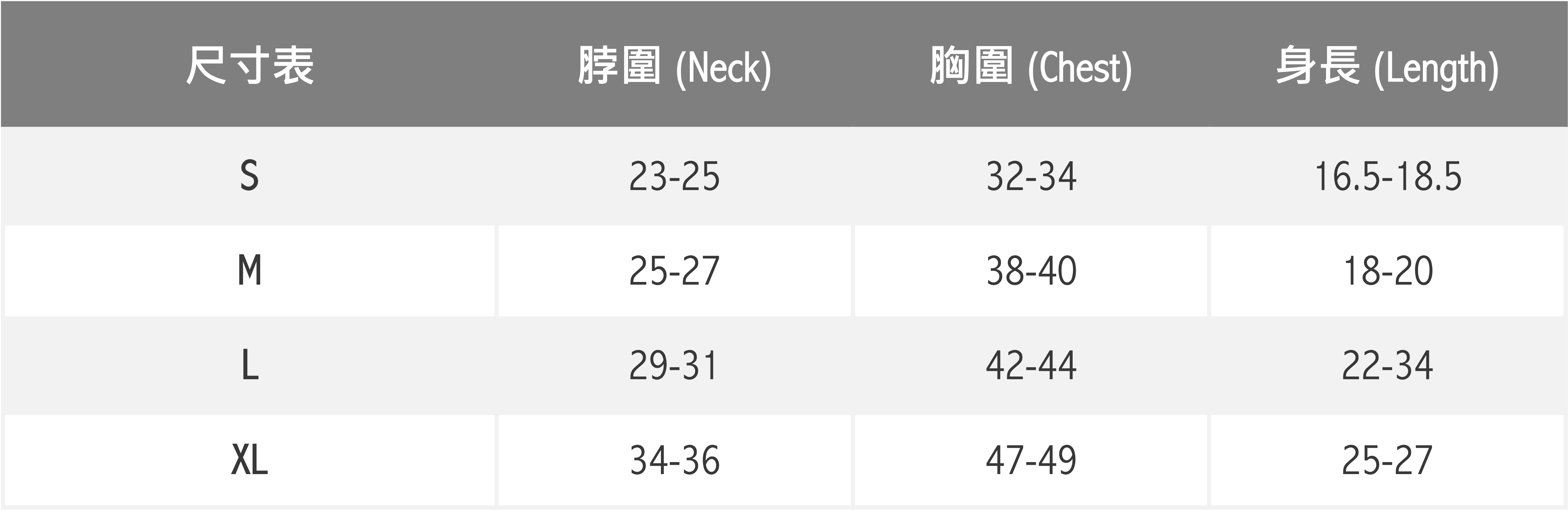 2. 尺寸選擇請以胸圍為主,衣長穿著起來的長度會因版型與狗狗身材而有不同。
