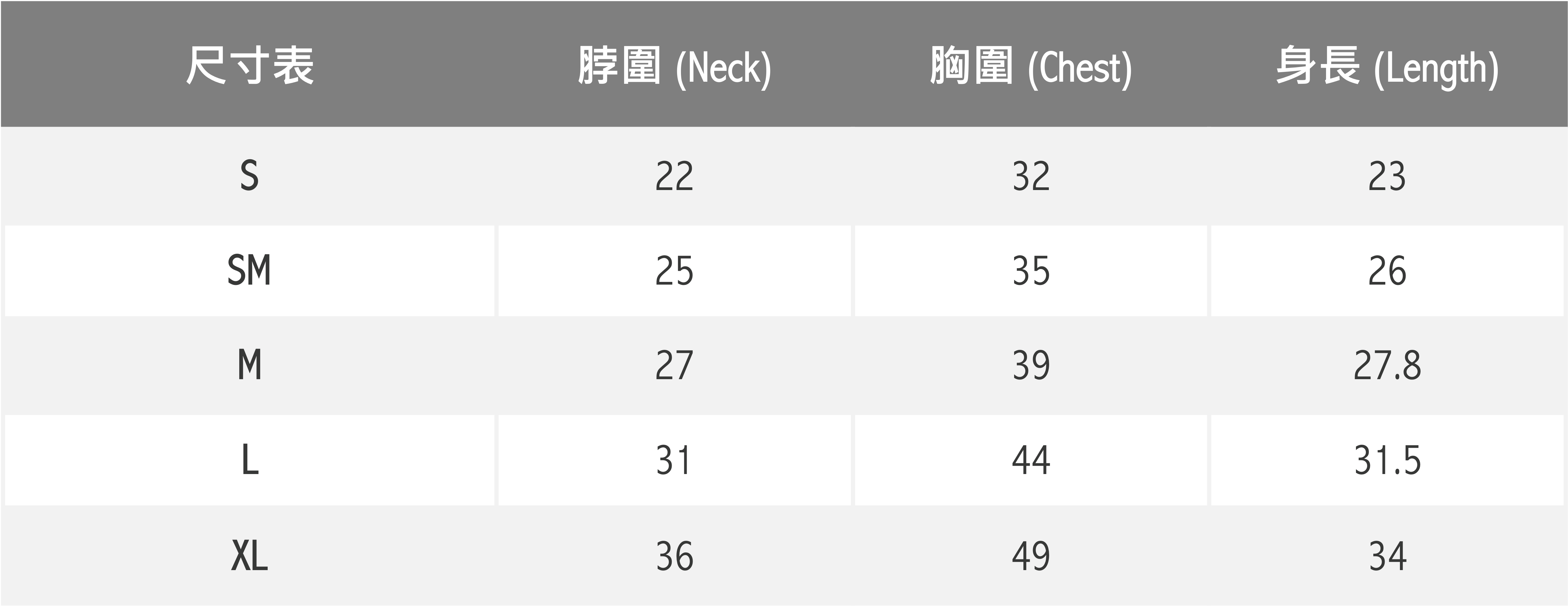 2. 尺寸選擇請以胸圍為主,衣長穿著起來的長度會因版型與狗狗身材而有不同。