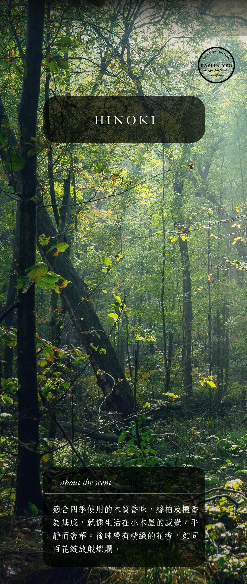 適合四季使用的木質香味,絲柏及檀香為基底,就像生活在小木屋的感覺,平靜而奢華。後味帶有精緻的花香,如同百花綻放般燦爛。