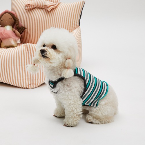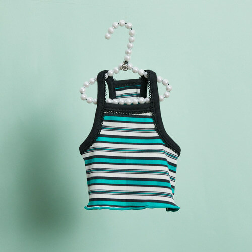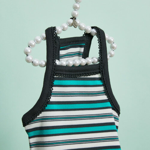 這款 Aqua 條紋蕾絲無袖上衣,以清爽活潑的水綠色為主軸,搭配多色條紋與優雅蕾絲滾邊,