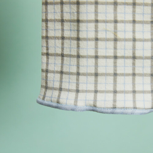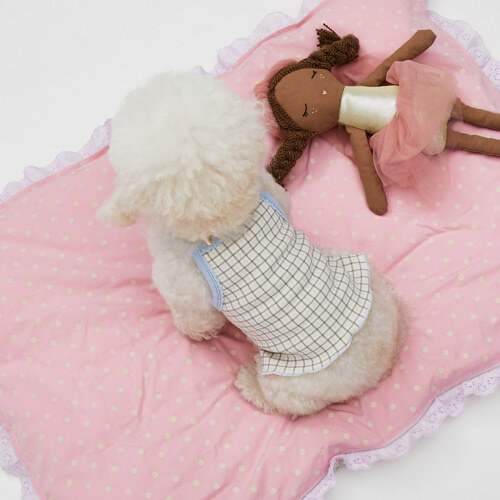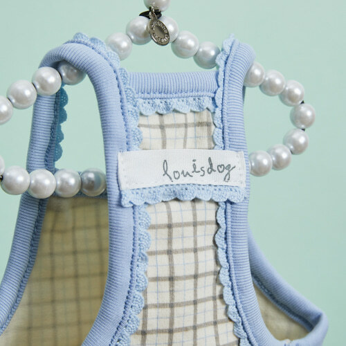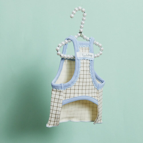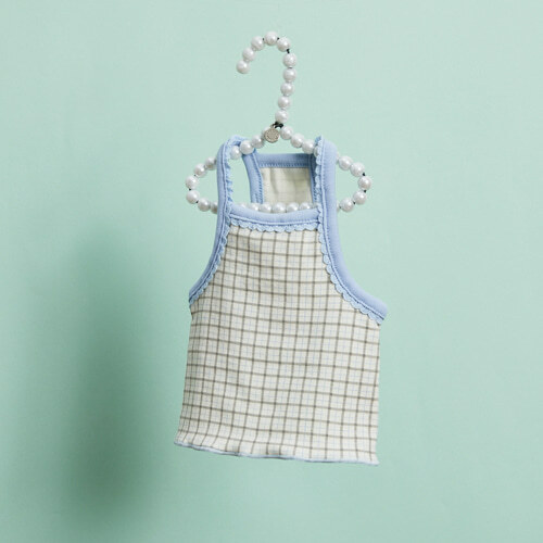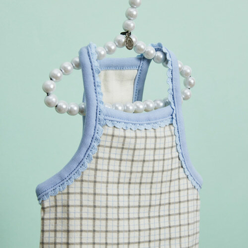 藍野午茶無袖上衣 以米杏色格紋搭配柔和的粉藍色蕾絲滾邊,展現療癒系的輕甜氛圍。