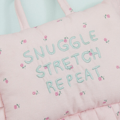 柔軟的棉質表面上,繡有「Snuggle Stretch Repeat」的療癒訊息,象徵著狗狗們最愛的日常節奏:「依偎、伸展、再來一次!」