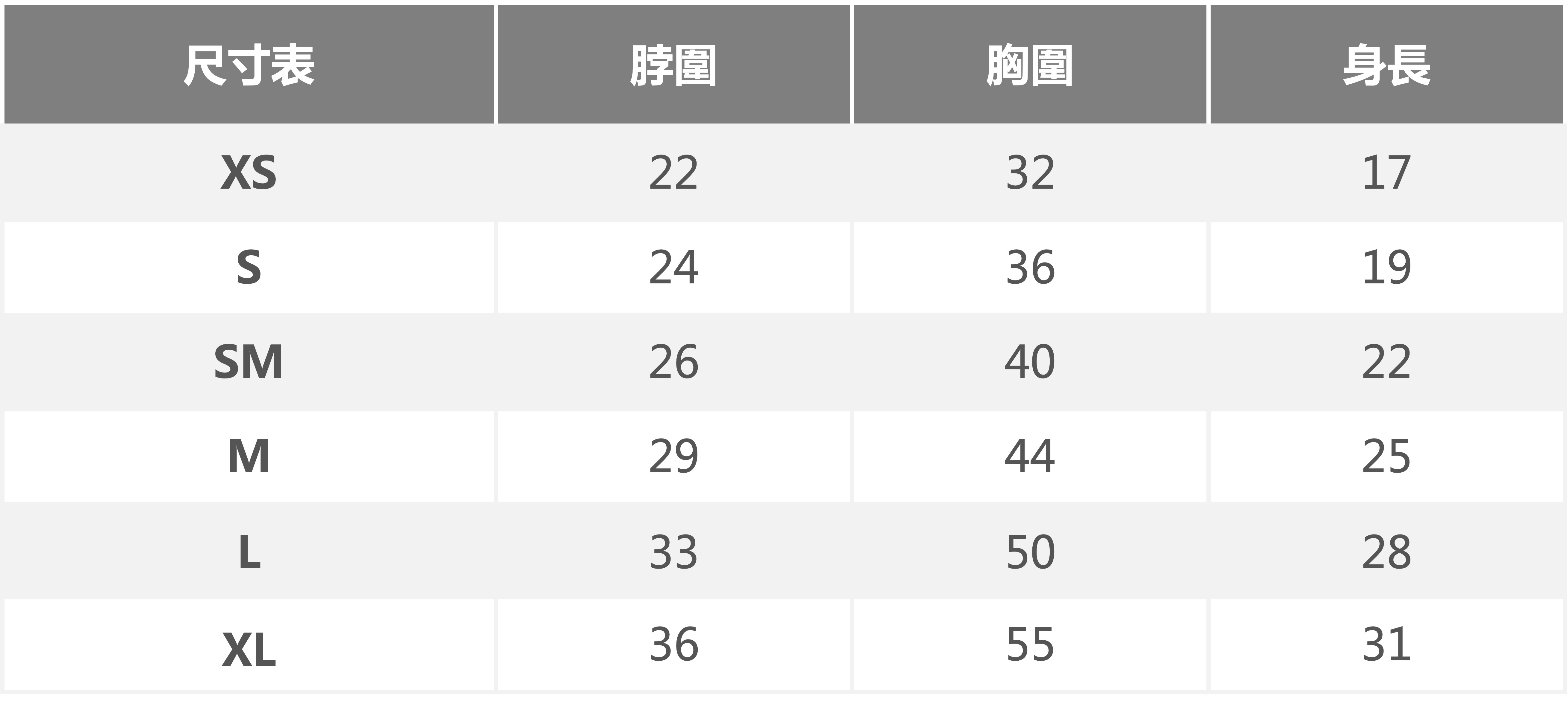 2. 尺寸選擇請以胸圍為主,衣長穿著起來的長度會因版型與狗狗身材而有不同。