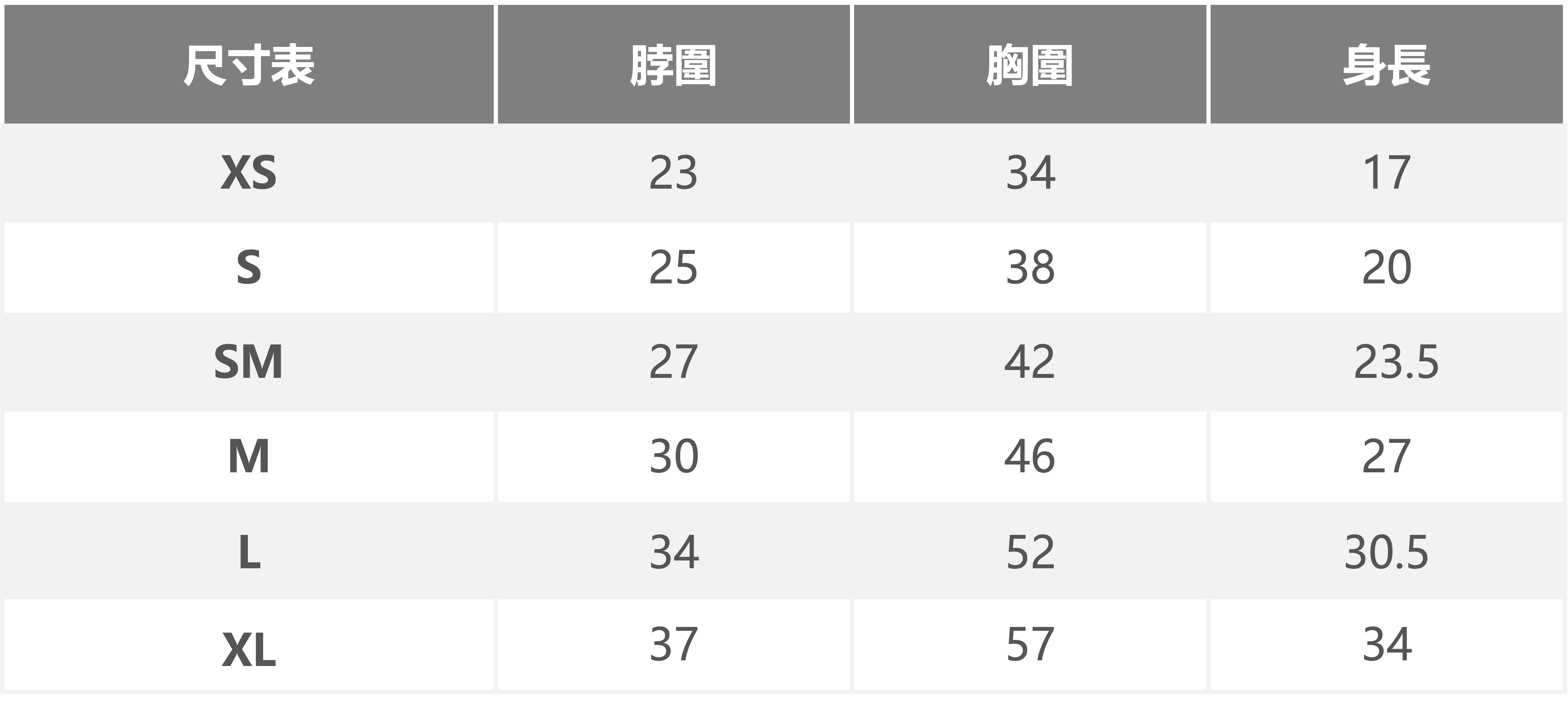 2. 尺寸選擇請以胸圍為主,衣長穿著起來的長度會因版型與狗狗身材而有不同。