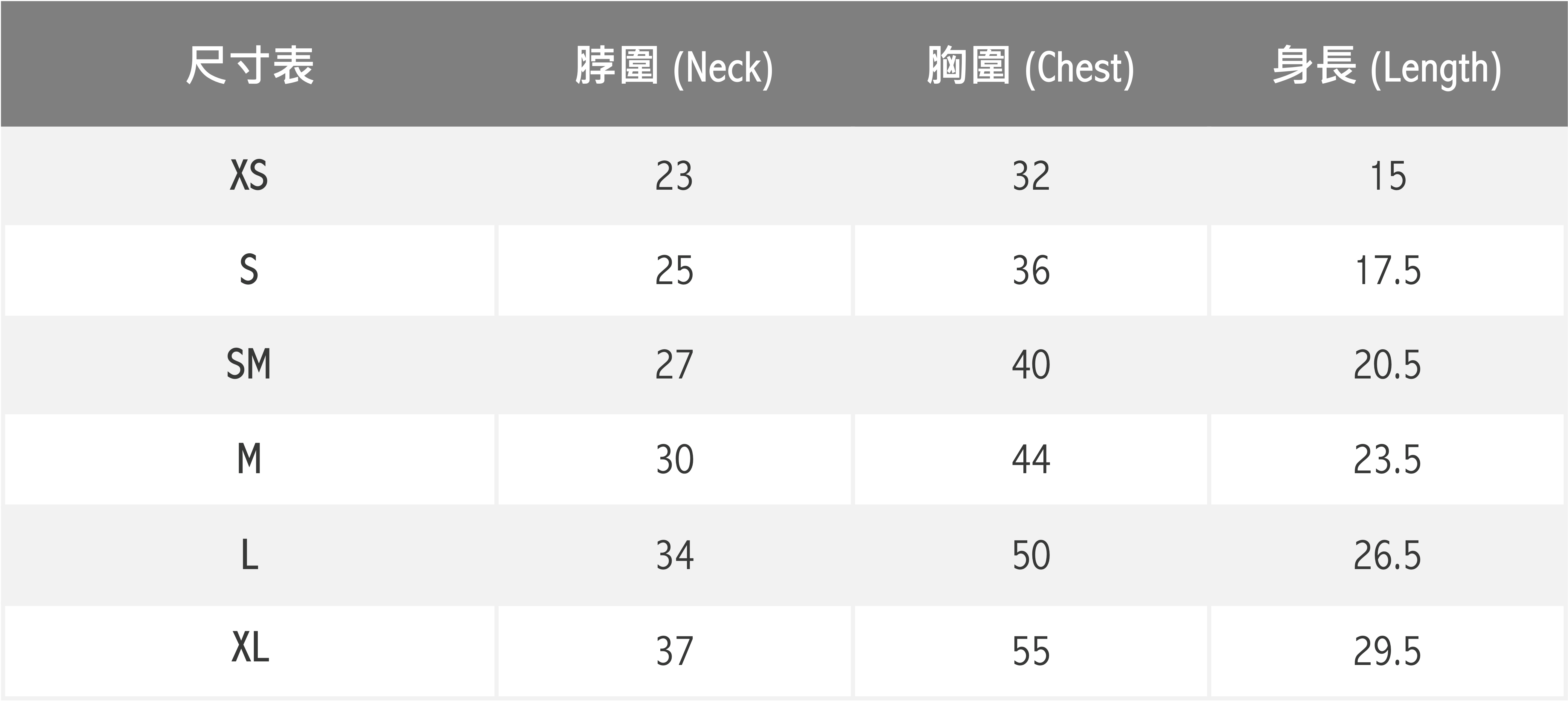 2. 尺寸選擇請以胸圍為主,衣長穿著起來的長度會因版型與狗狗身材而有不同。