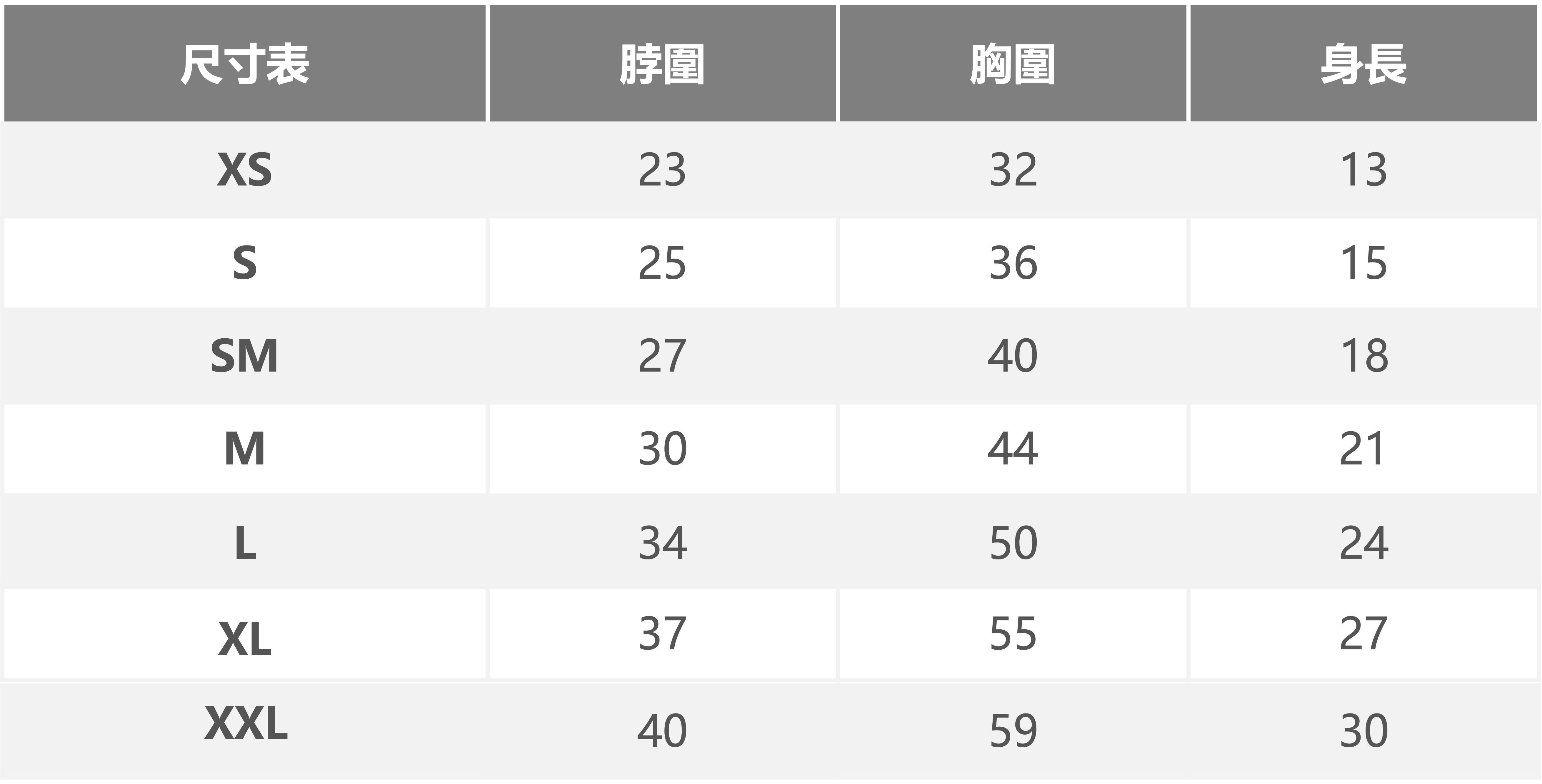 2. 尺寸選擇請以胸圍為主,衣長穿著起來的長度會因版型與狗狗身材而有不同。