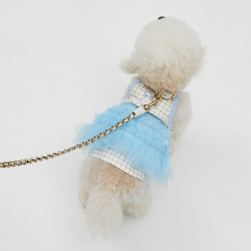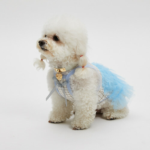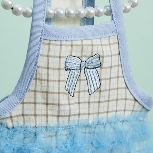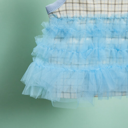 法式藍格紋澎澎洋裝 採用柔軟彈性棉布為主體,搭配層層義大利進口藍色網紗,打造輕盈蓬鬆的芭蕾裙輪廓。