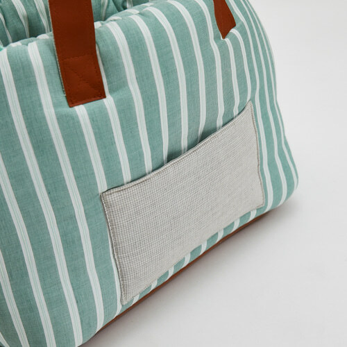 手把選用天然皮革製成,提升整體質感與耐用度。內附可拆式坐墊與安全扣繩,兩側還有實用口袋設計,讓這只包在造型與機能之間完美平衡。