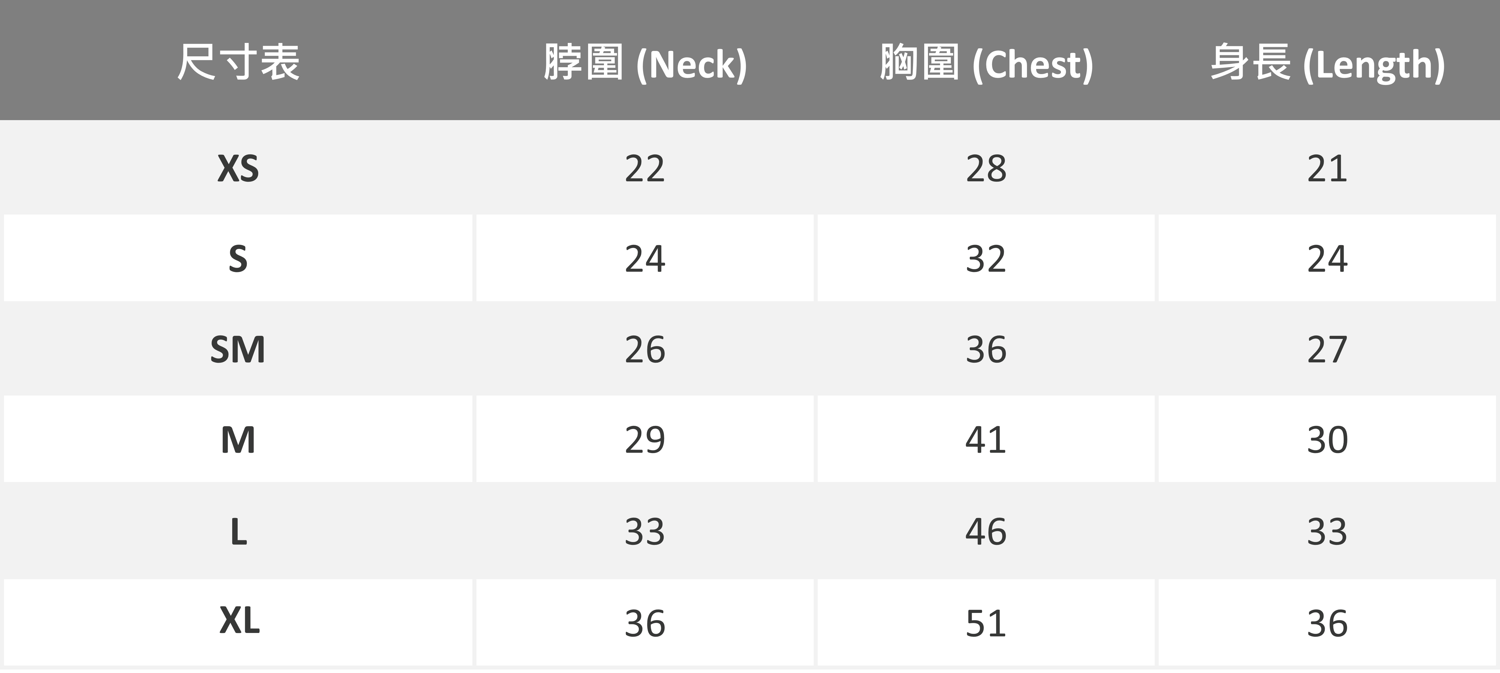 2. 尺寸選擇請以胸圍為主,衣長穿著起來的長度會因版型與狗狗身材而有不同。