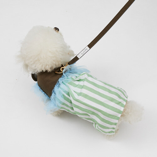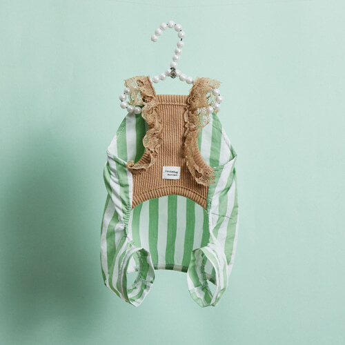 肩帶以復古蕾絲與咖啡色羅紋交織,穩定包覆毛孩肩膀的同時,也展現溫柔細節,造型感與舒適性兼具。