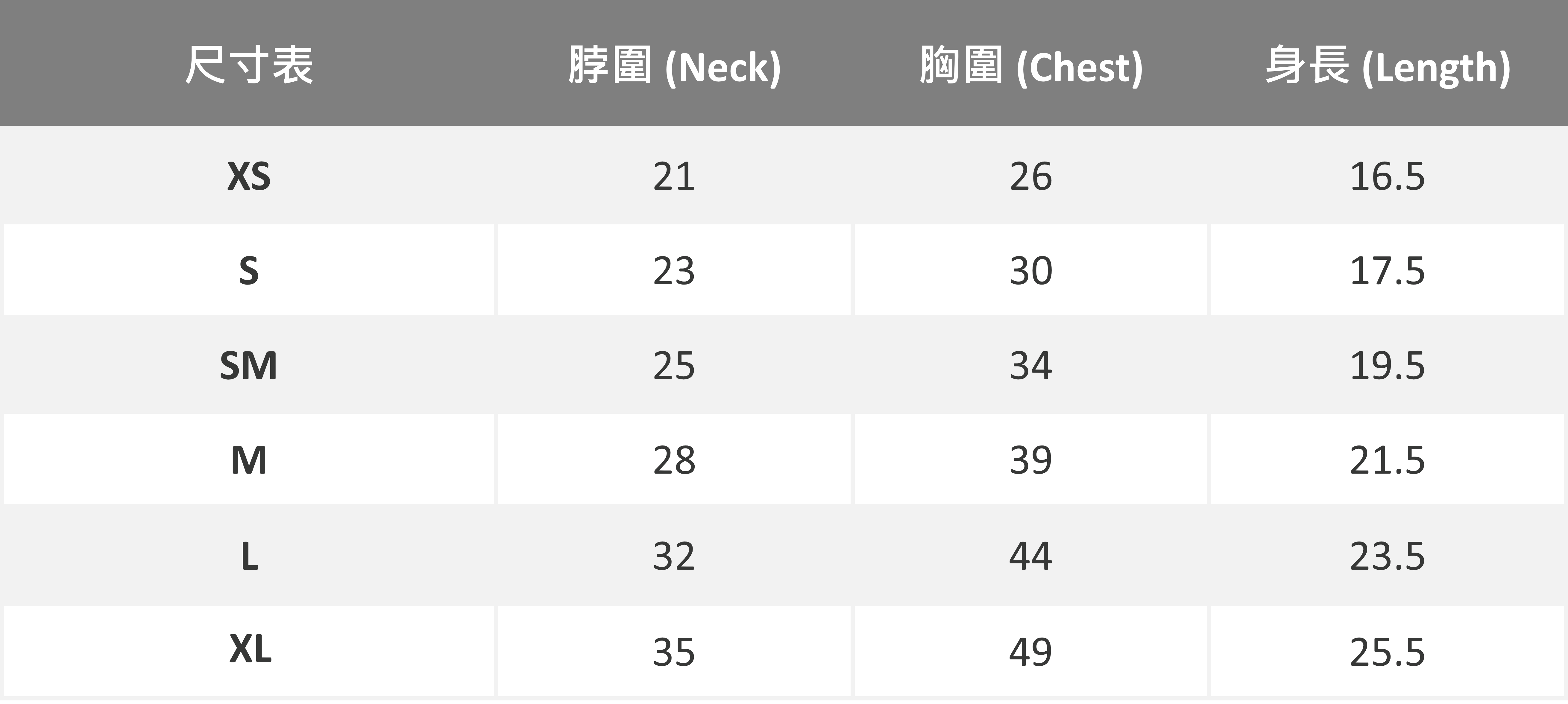 2. 尺寸選擇請以胸圍為主,衣長穿著起來的長度會因版型與狗狗身材而有不同。