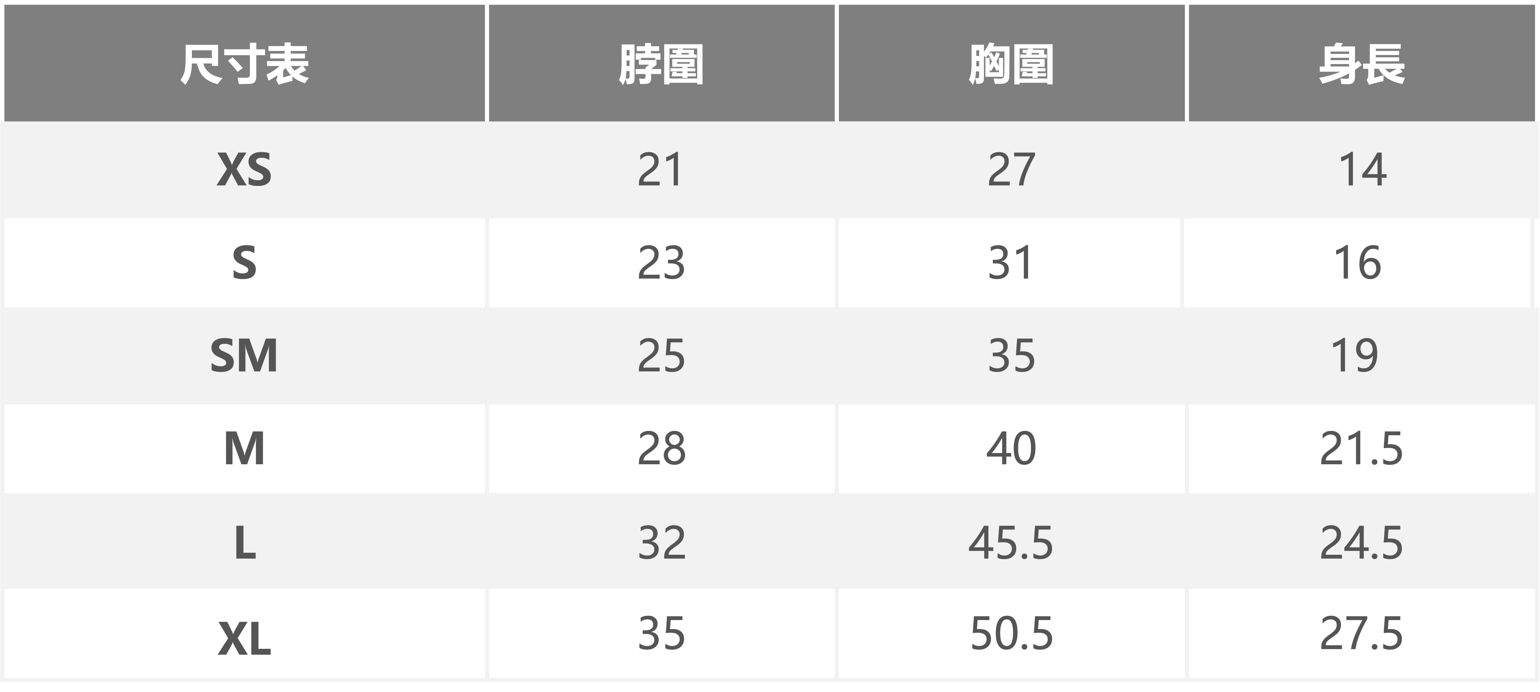 2. 尺寸選擇請以胸圍為主,衣長穿著起來的長度會因版型與狗狗身材而有不同。
