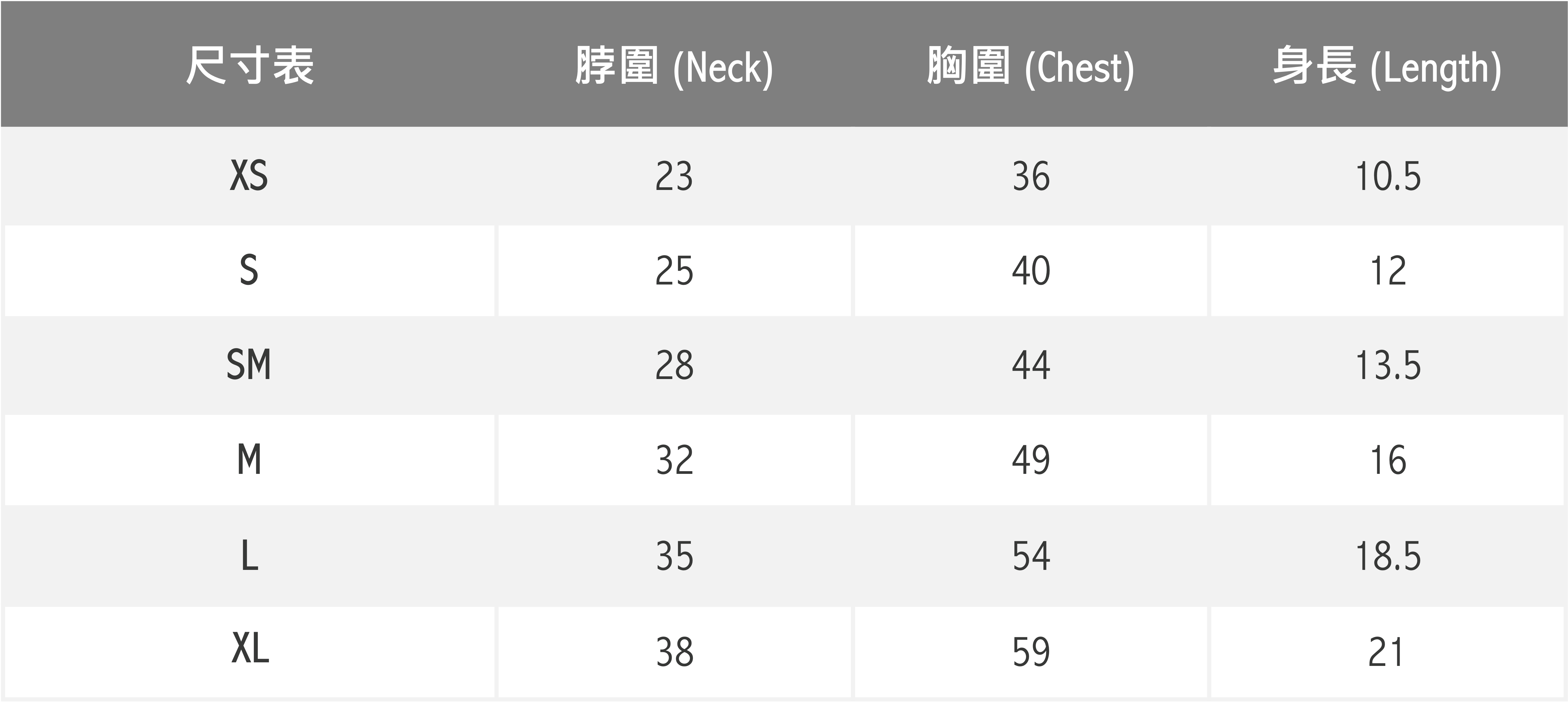 2. 尺寸選擇請以胸圍為主,衣長穿著起來的長度會因版型與狗狗身材而有不同。