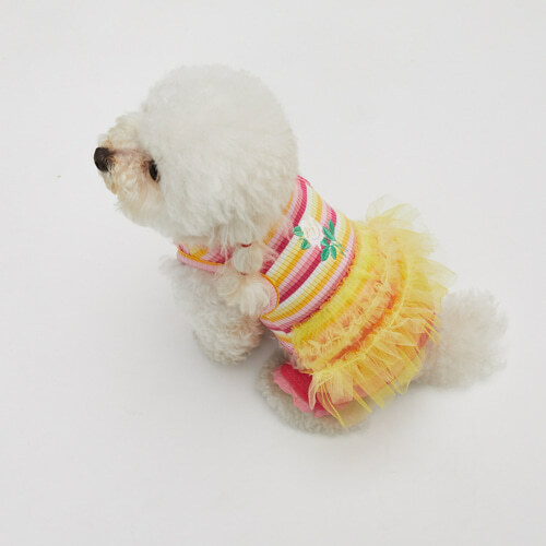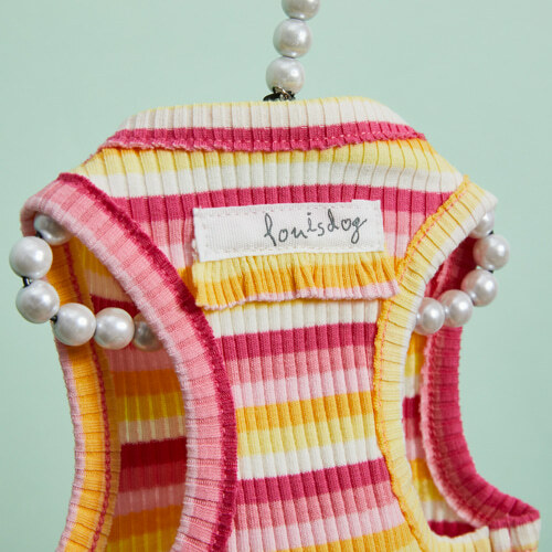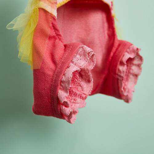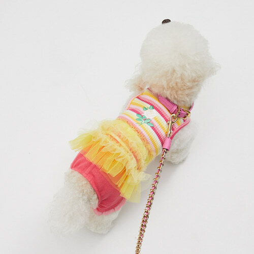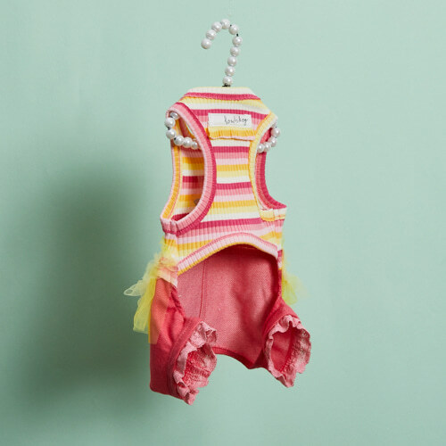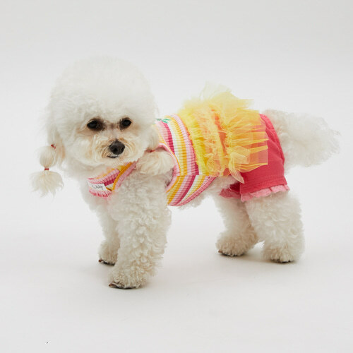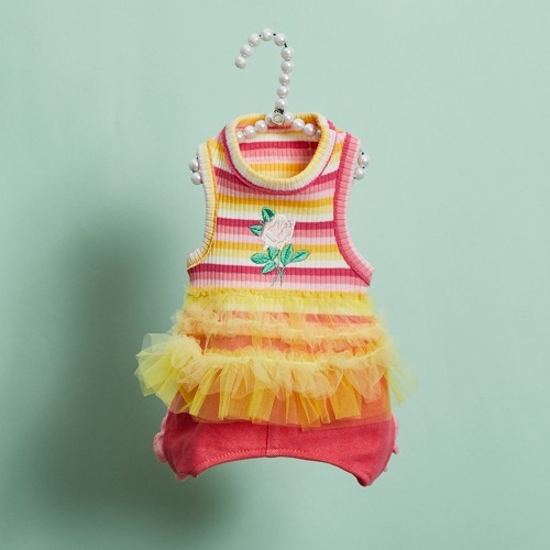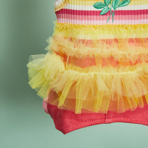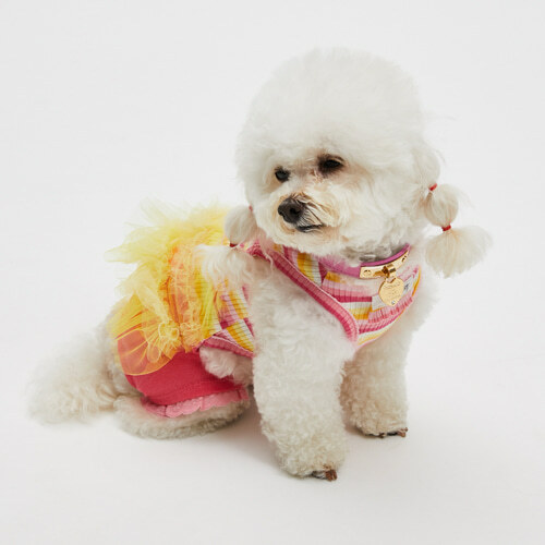 陽光玫瑰澎澎吊帶褲(Sole TUTU Pants),以鮮明的粉黃條紋為基底,搭配柔和羅紋布與義大利製亮黃色網紗蓬裙,
