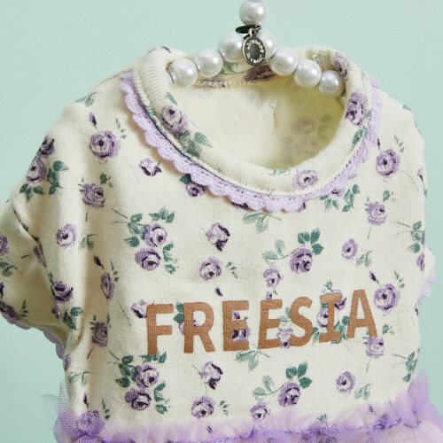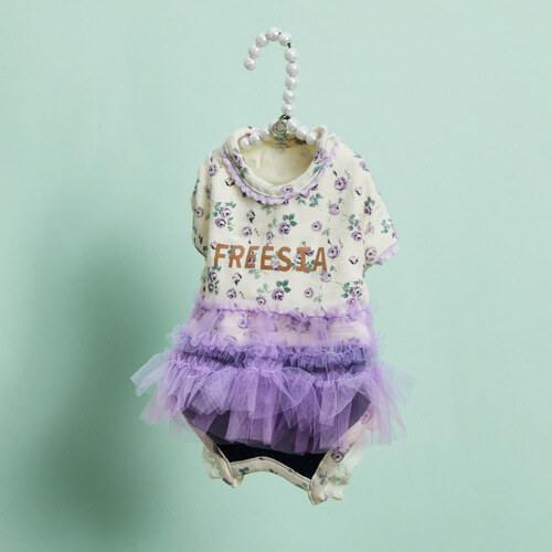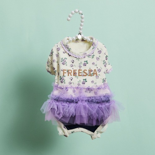 紫羅蘭花園澎澎吊帶褲(Viola TUTU Pants),以奶油底搭配紫色小花印花,中央綴上「FREESIA」字樣,繽紛卻不失優雅。