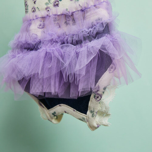 層層薰衣草色義大利網紗交疊出夢幻裙襬,下擺為 stir-up 褲設計,可套在腳掌上,活動時也不易滑動,兼具造型與實穿性。
