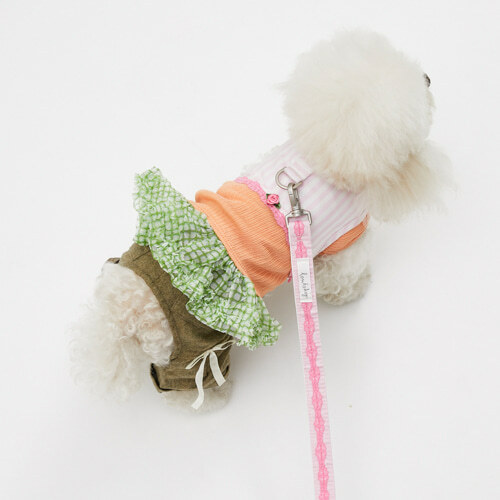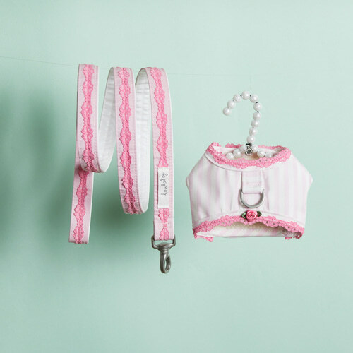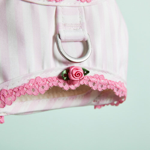 選用來自義大利科莫地區的高級絲棉混紡面料,將法式內衣的細緻與優雅巧妙融入寵物時尚中。條紋設計結合蕾絲與迷你玫瑰花飾,營造出柔美浪漫的氛圍,讓日常散步也能成為一場法式風情的演出。