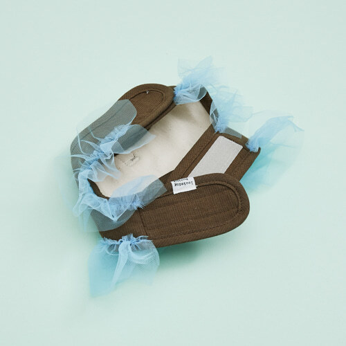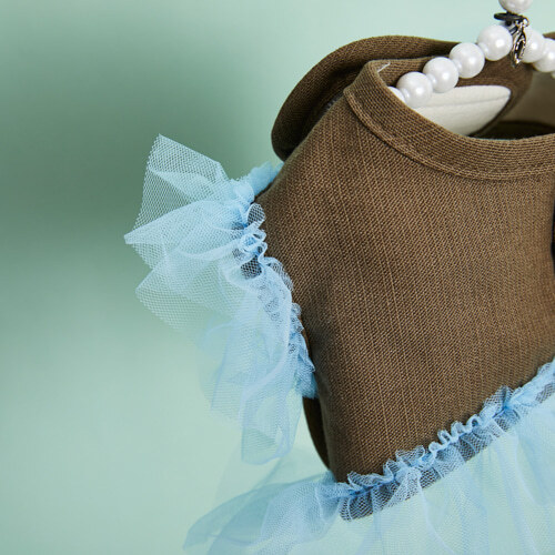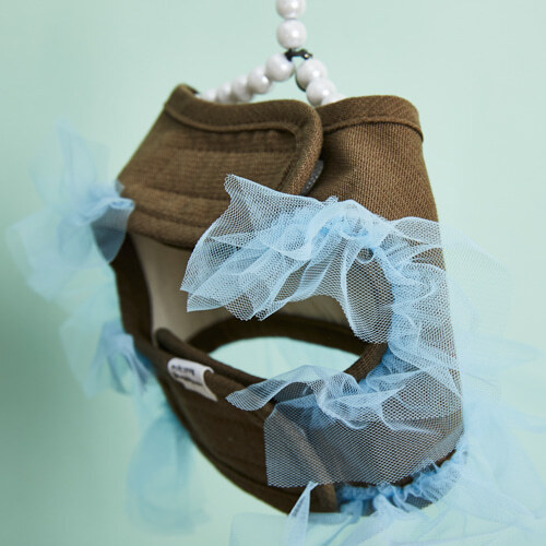 經典的摩卡棕與法式藍拼接配色,結合義大利進口的雙層蓬裙紗網,營造充滿層次與立體感的甜美廓形。