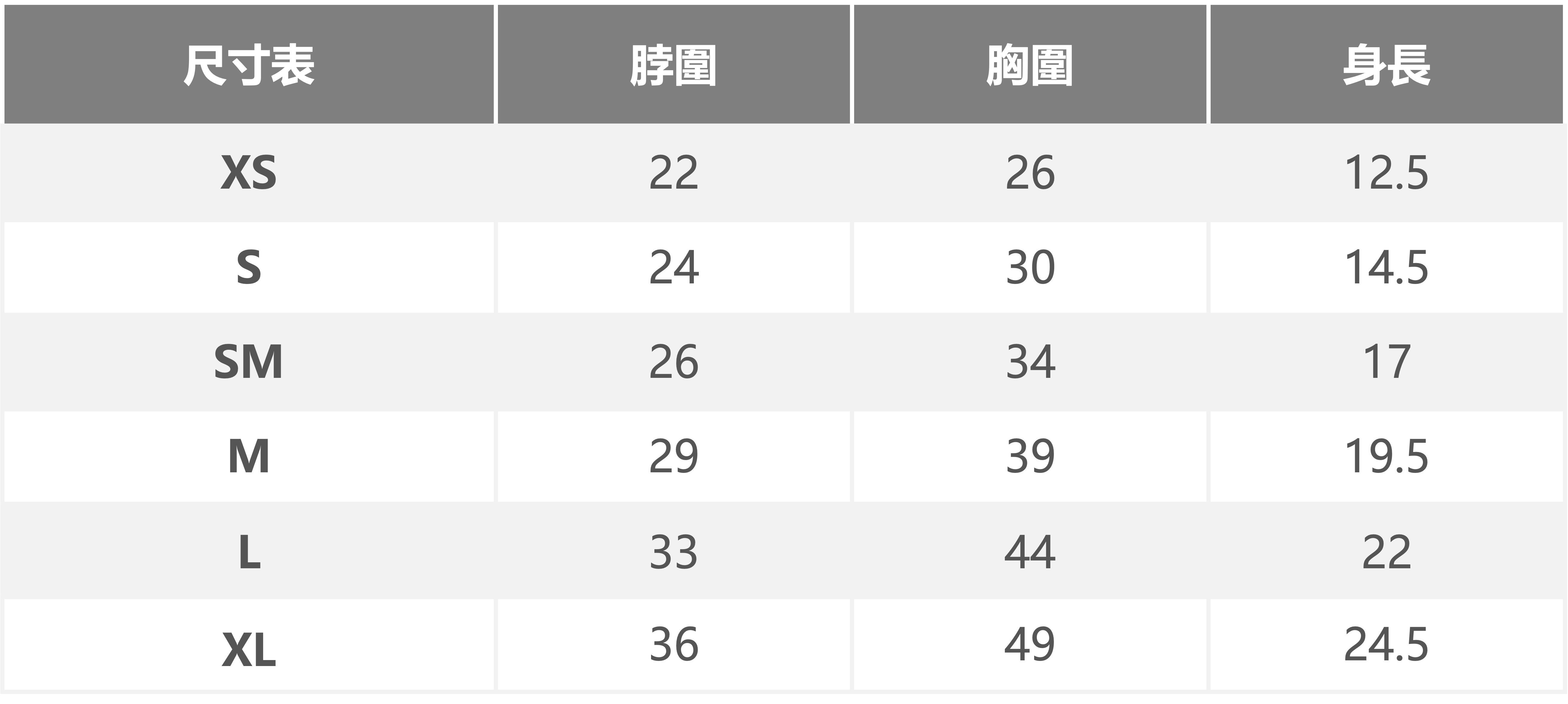 2. 尺寸選擇請以胸圍為主,衣長穿著起來的長度會因版型與狗狗身材而有不同。