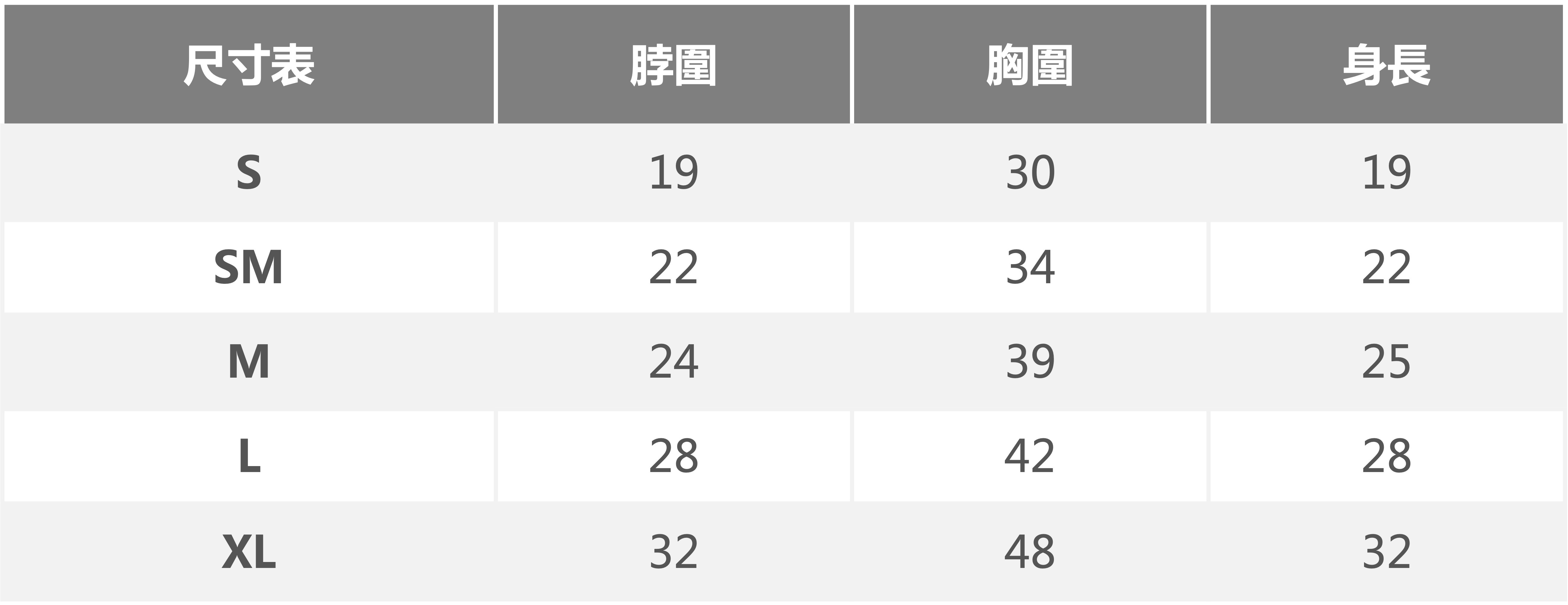* 尺寸選擇請以胸圍為主,衣長穿著起來的長度會因版型與狗狗身材而有不同。