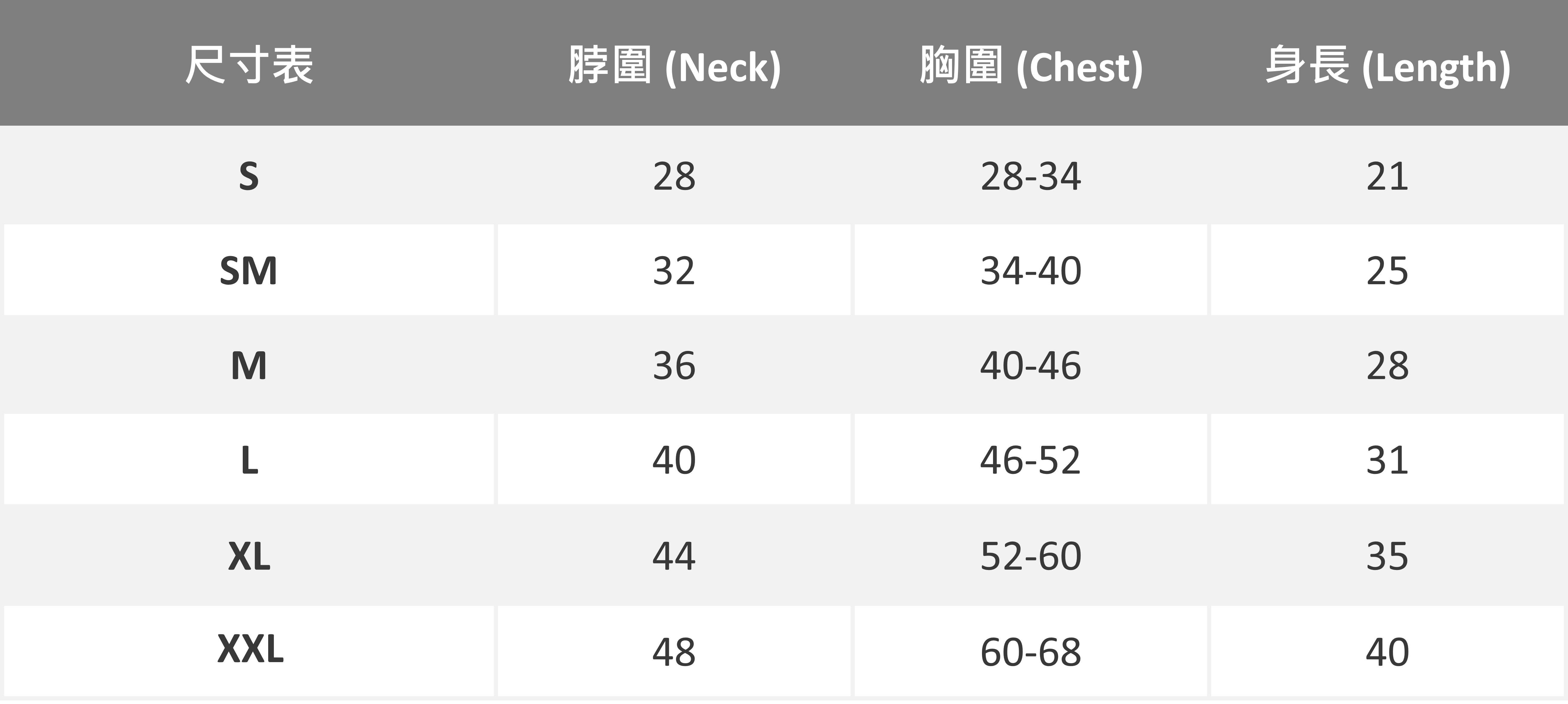 2. 尺寸選擇請以胸圍為主,衣長穿著起來的長度會因版型與狗狗身材而有不同。