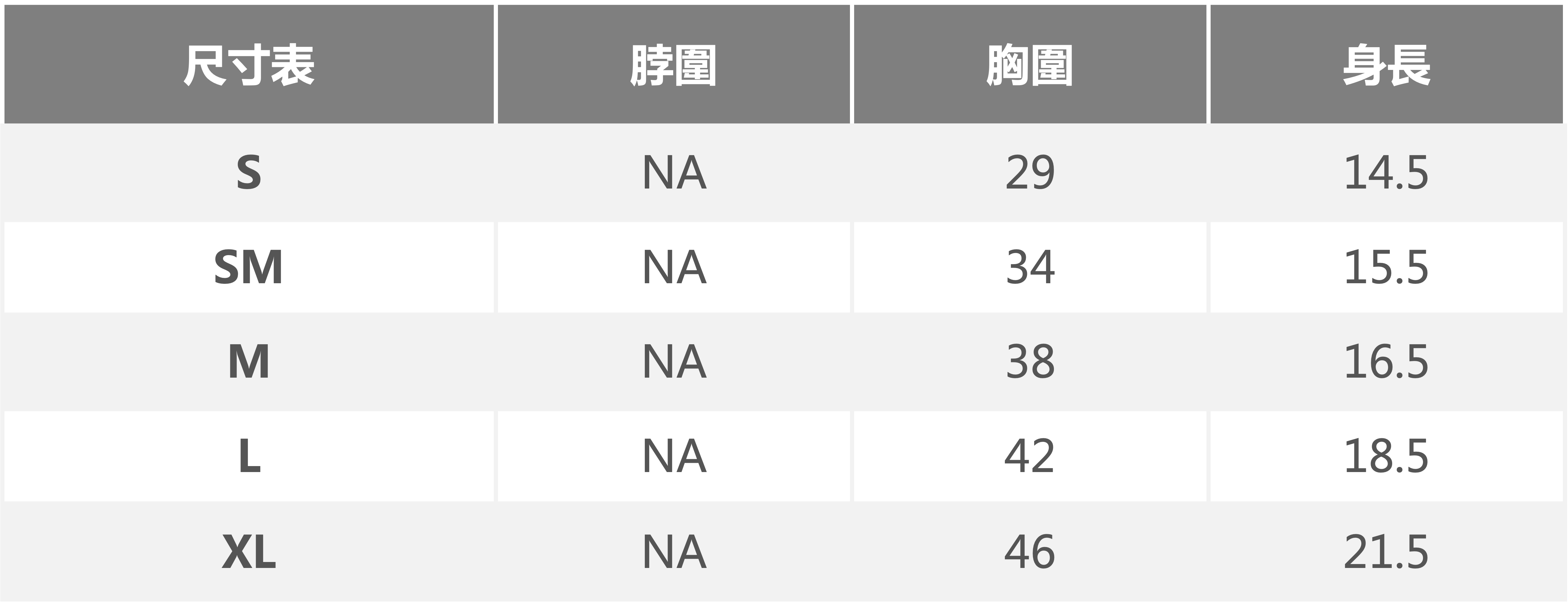 2. 尺寸選擇請以胸圍為主,衣長穿著起來的長度會因版型與狗狗身材而有不同。