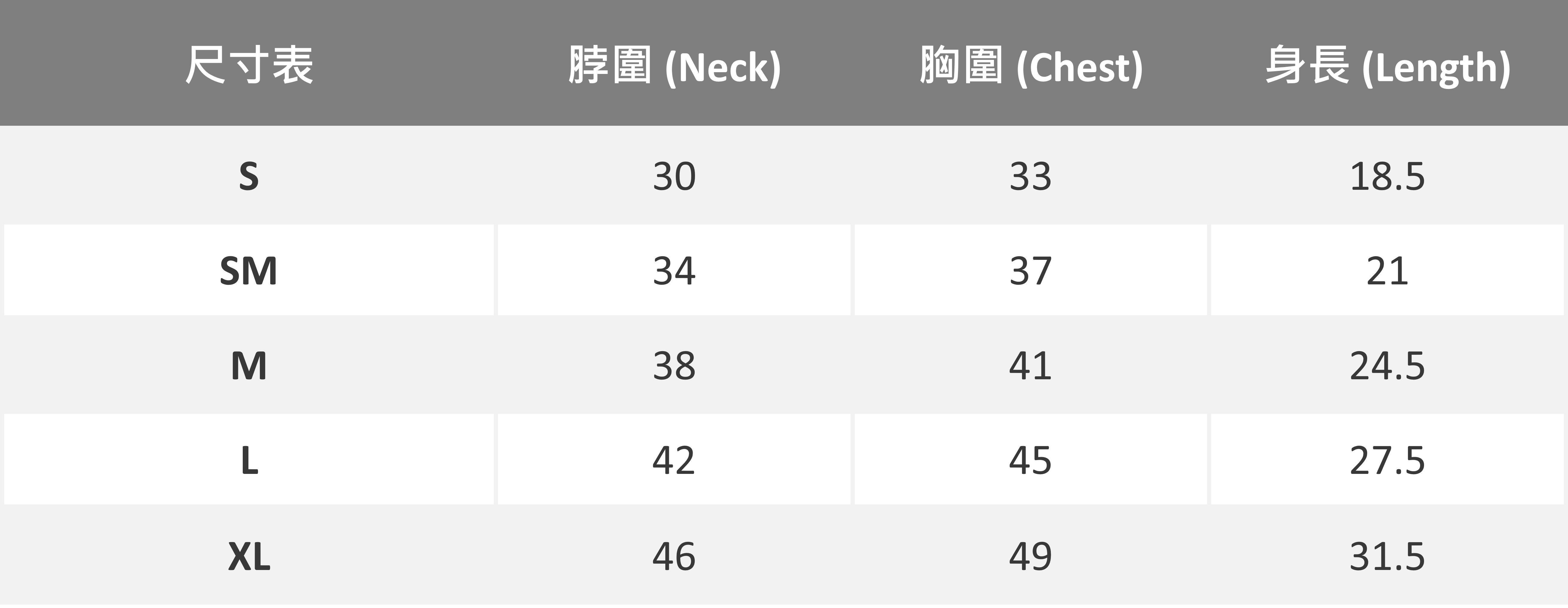 2. 尺寸選擇請以胸圍為主,衣長穿著起來的長度會因版型與狗狗身材而有不同。