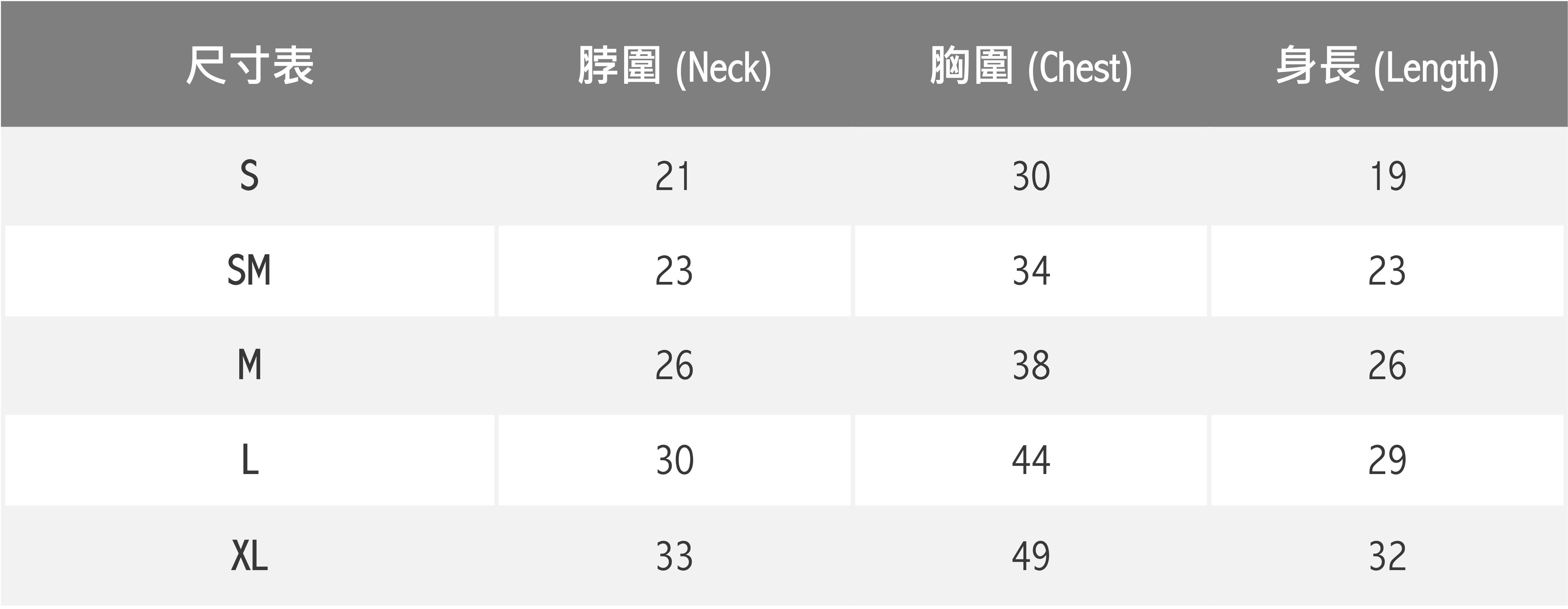 * 尺寸選擇請以胸圍為主,衣長穿著起來的長度會因版型與狗狗身材而有不同。