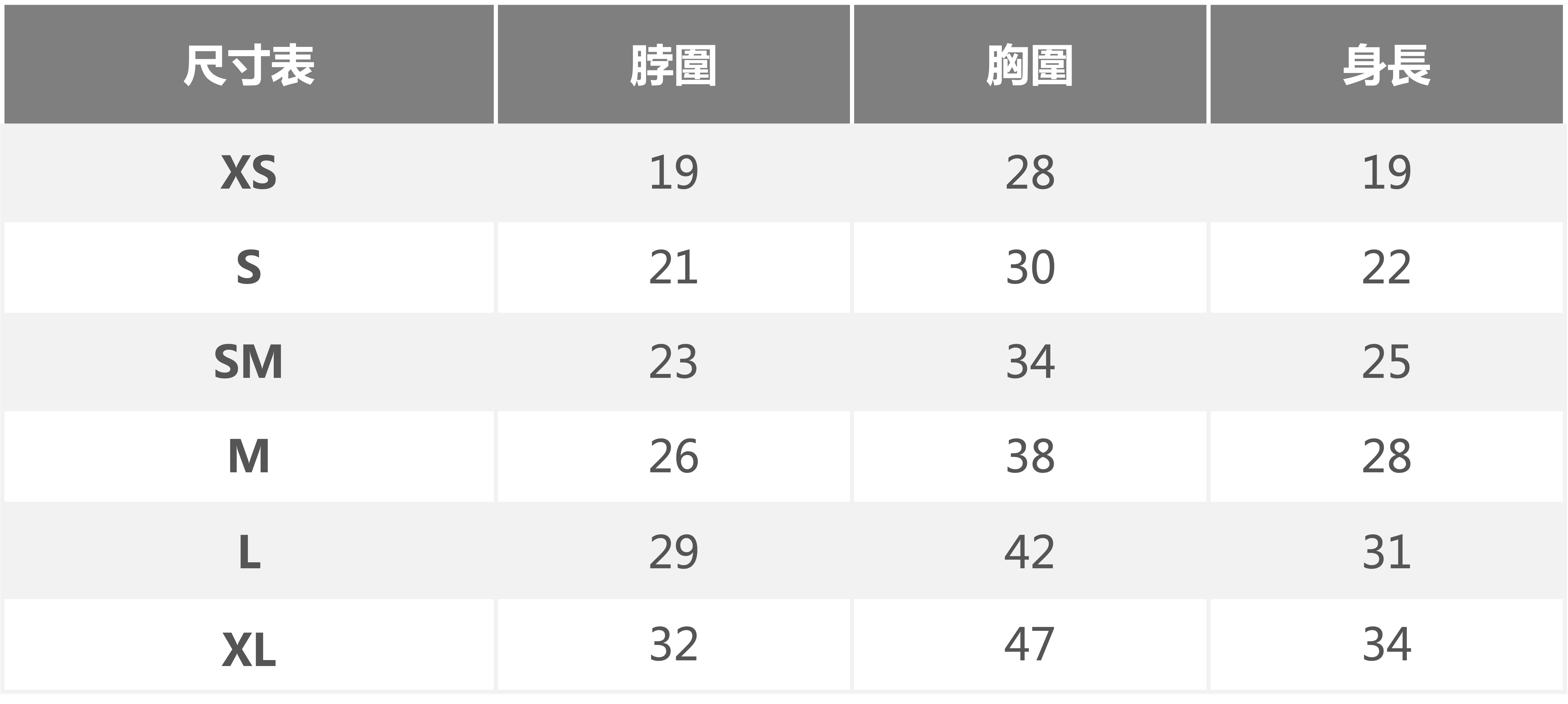 * 尺寸選擇請以胸圍為主,衣長穿著起來的長度會因版型與狗狗身材而有不同。