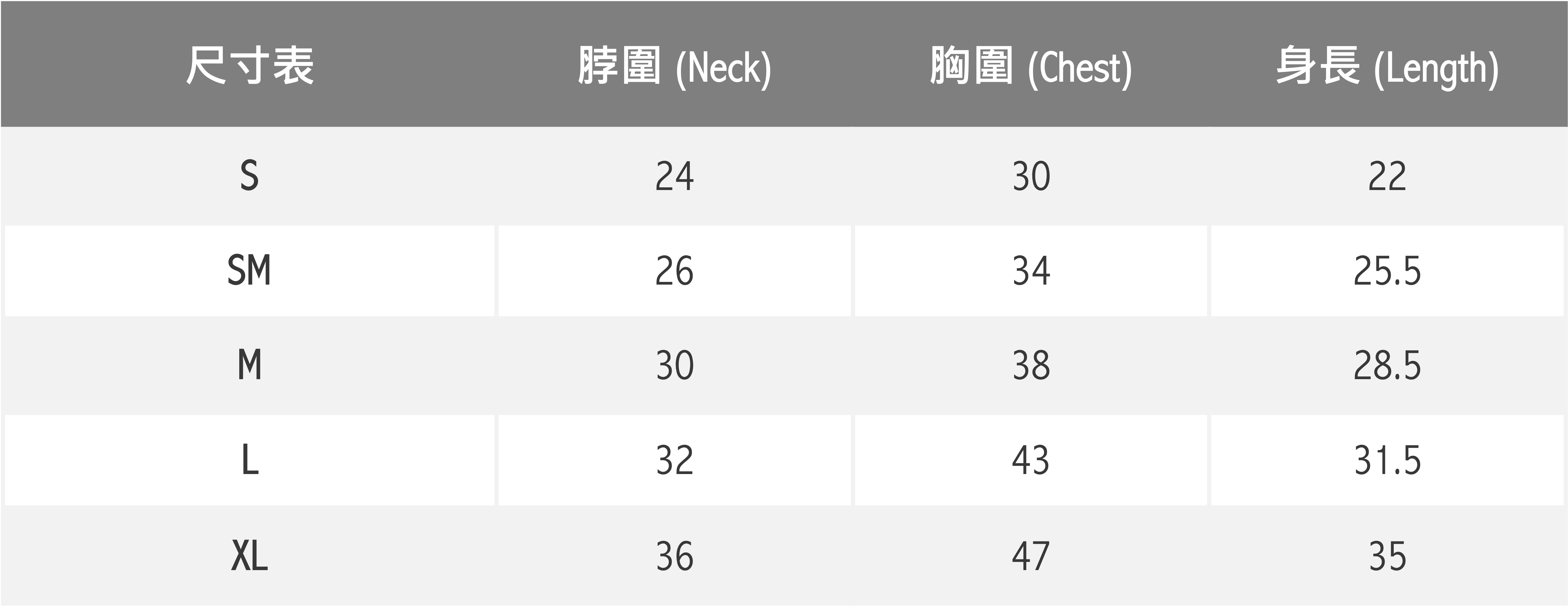 * 尺寸選擇請以胸圍為主,衣長穿著起來的長度會因版型與狗狗身材而有不同。