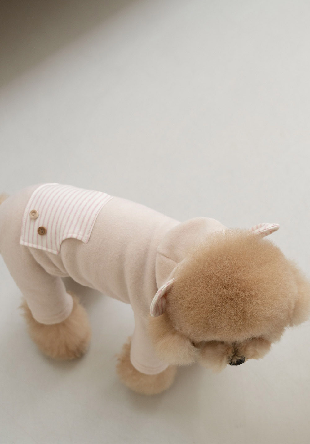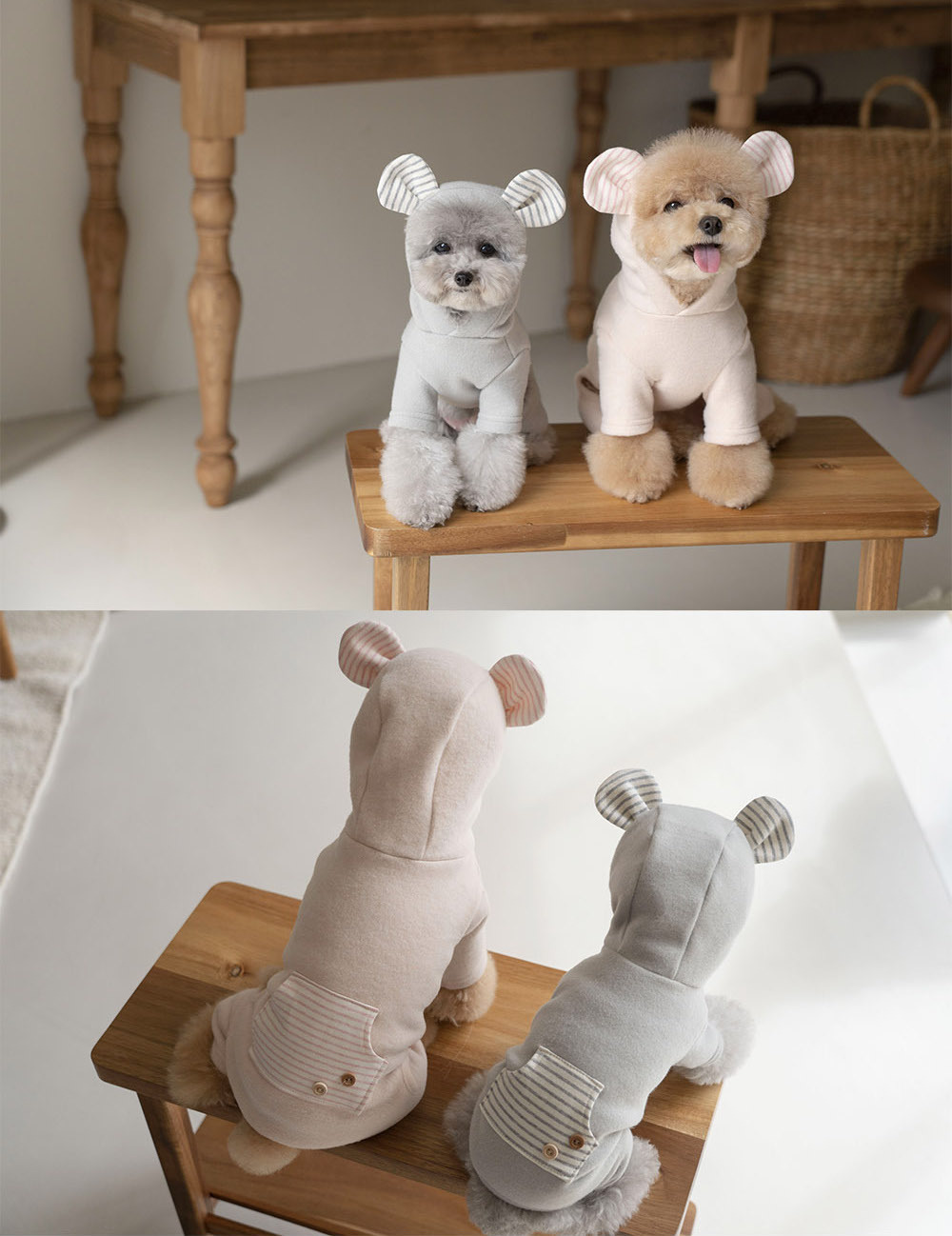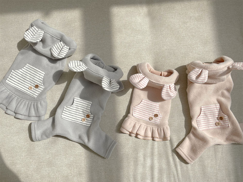 冬日保暖的軟刷毛材質,熊熊耳朵連帽設計,加上可愛的口袋與鈕扣造型,兩種款式:洋裝與連身褲可以選擇。
