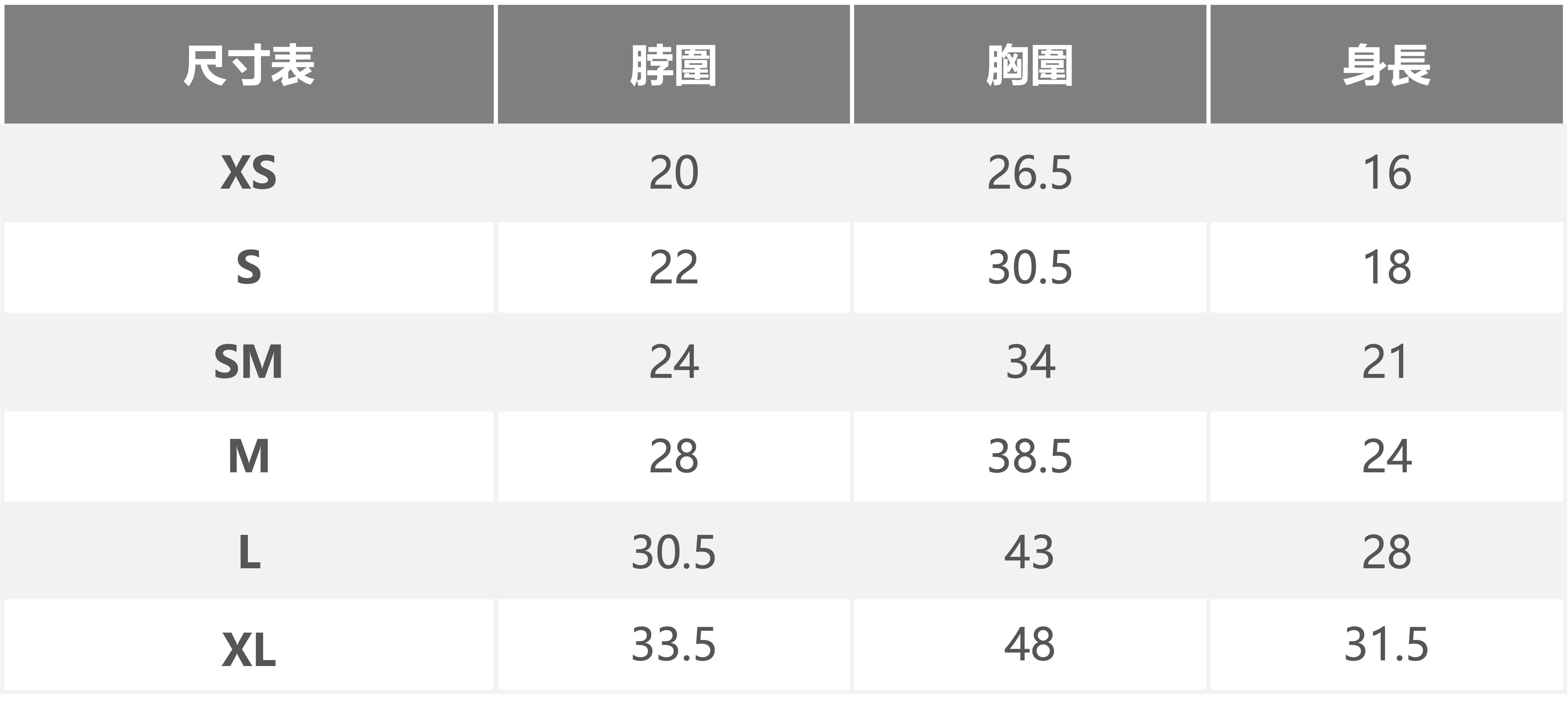2. 尺寸選擇請以胸圍為主,衣長穿著起來的長度會因版型與狗狗身材而有不同。