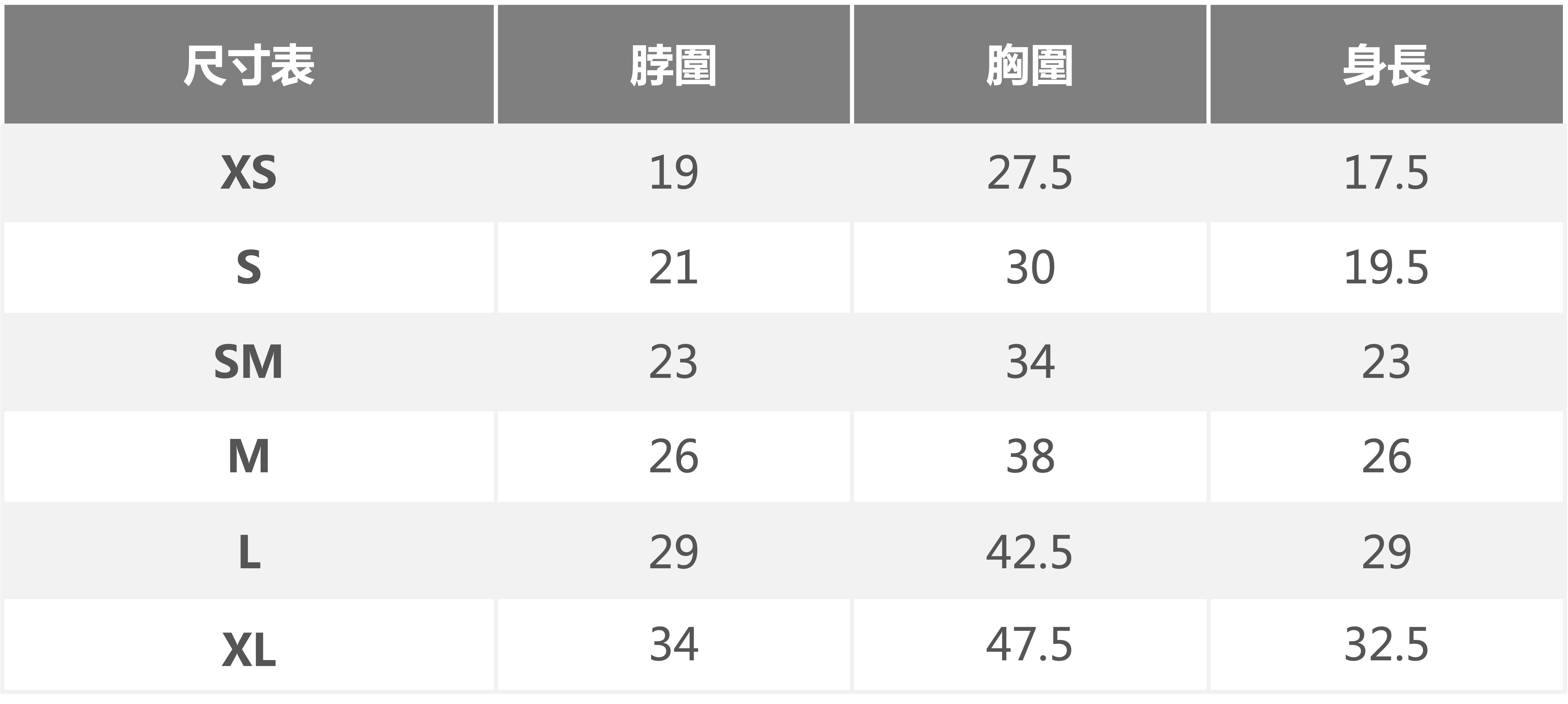 2. 尺寸選擇請以胸圍為主,衣長穿著起來的長度會因版型與狗狗身材而有不同。