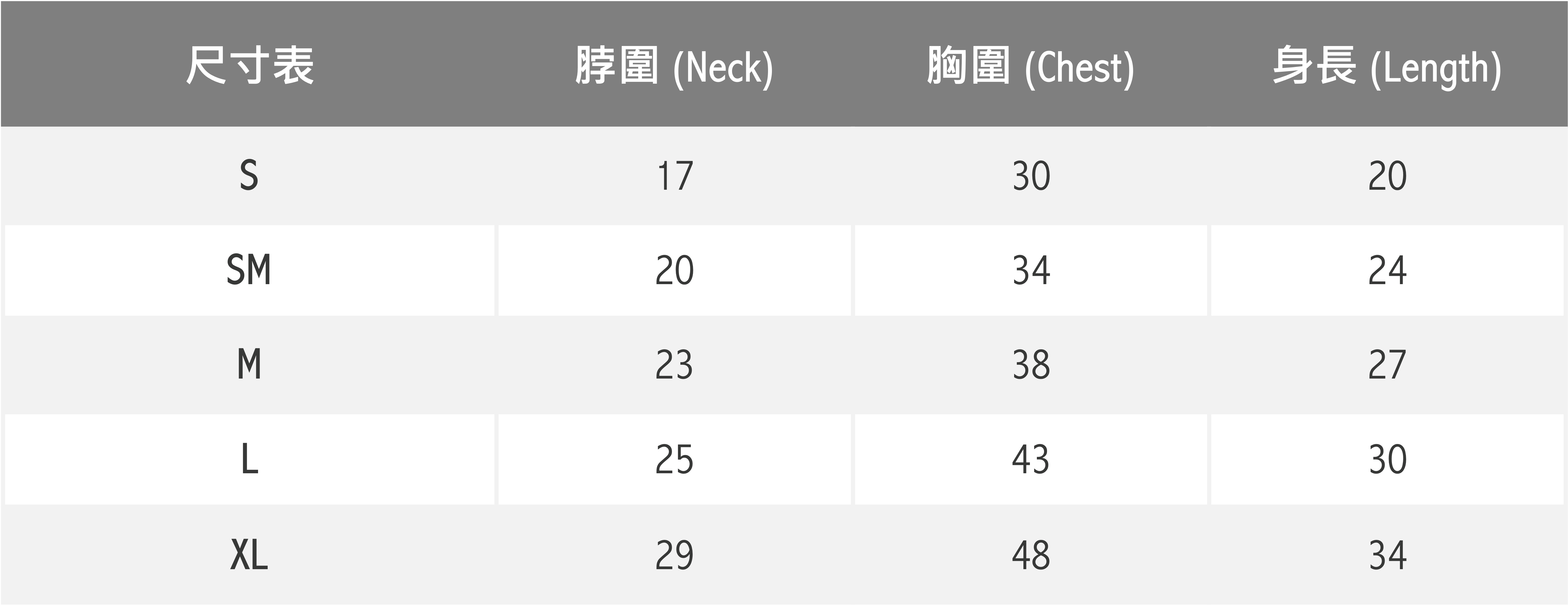 2. 尺寸選擇請以胸圍為主,衣長穿著起來的長度會因版型與狗狗身材而有不同。