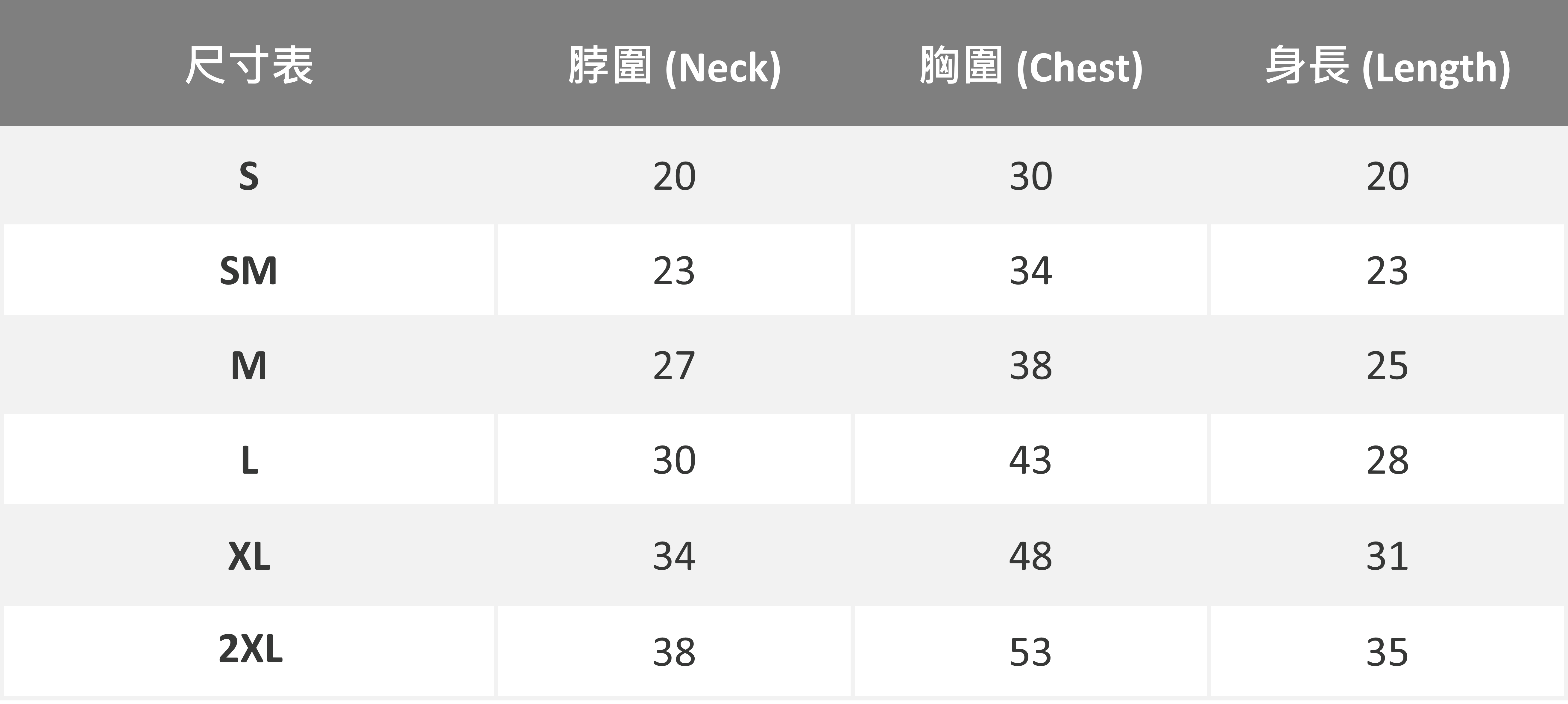 2. 尺寸選擇請以胸圍為主,衣長穿著起來的長度會因版型與狗狗身材而有不同。