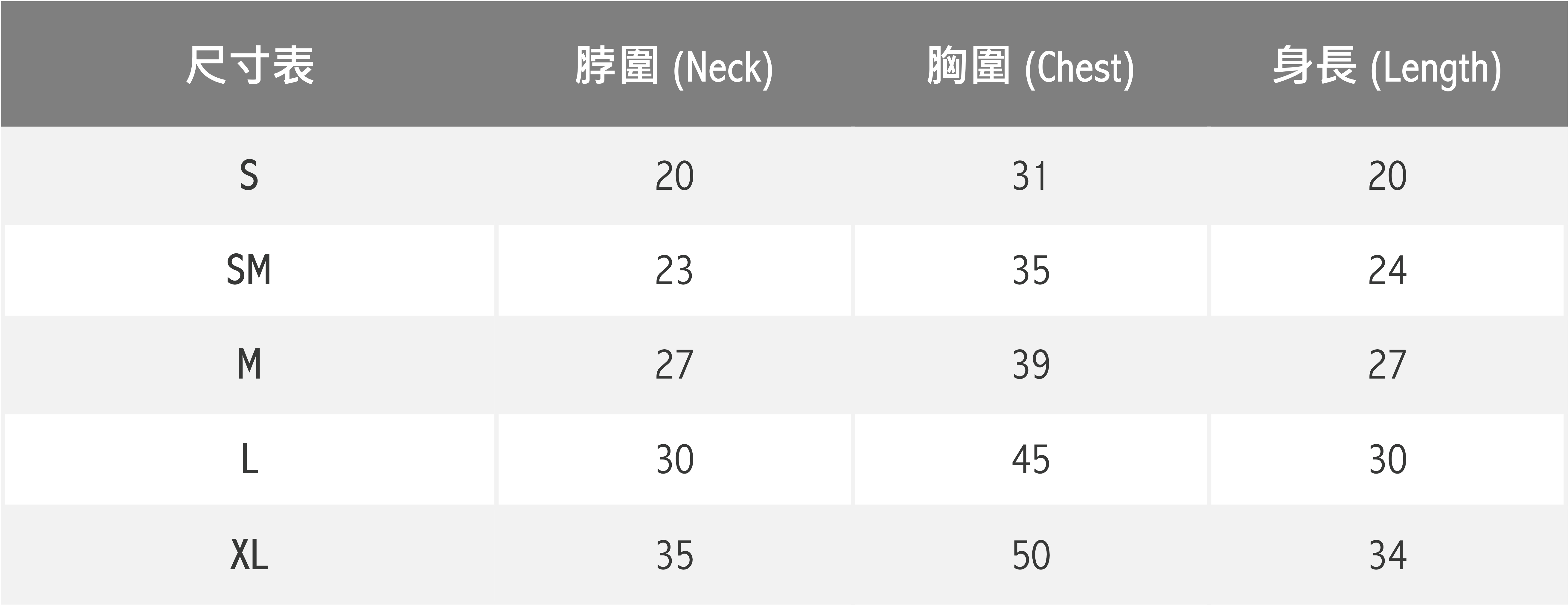 2. 尺寸選擇請以胸圍為主,衣長穿著起來的長度會因版型與狗狗身材而有不同。