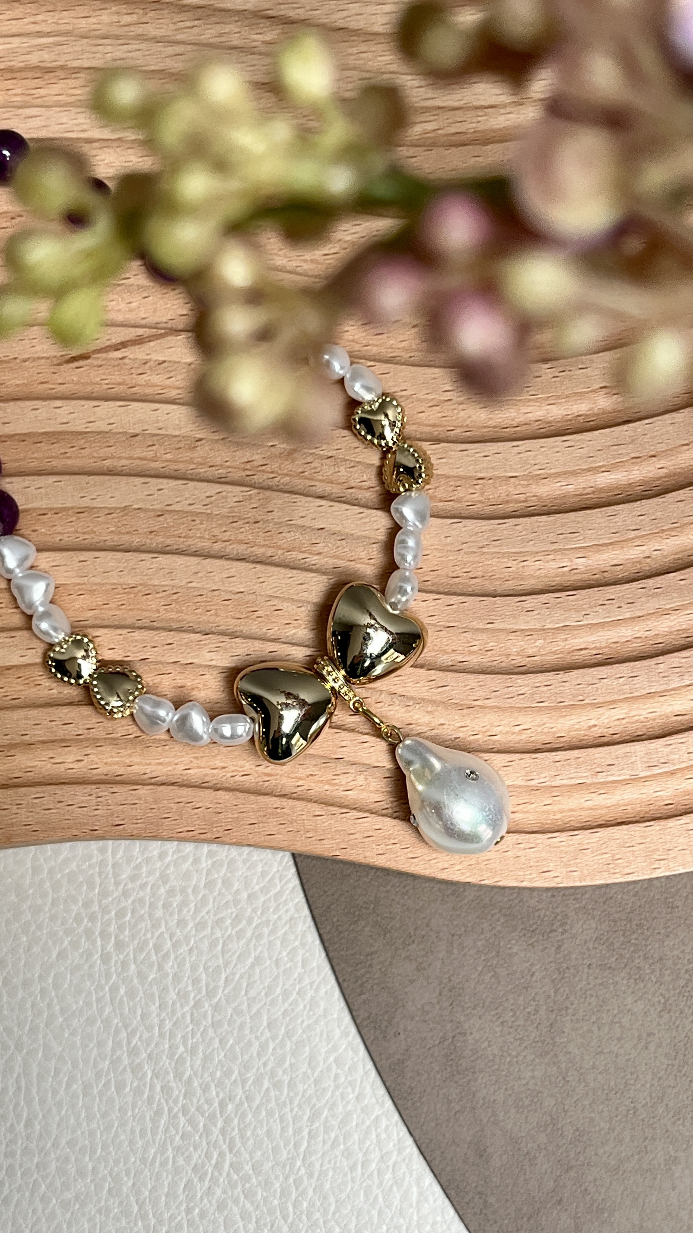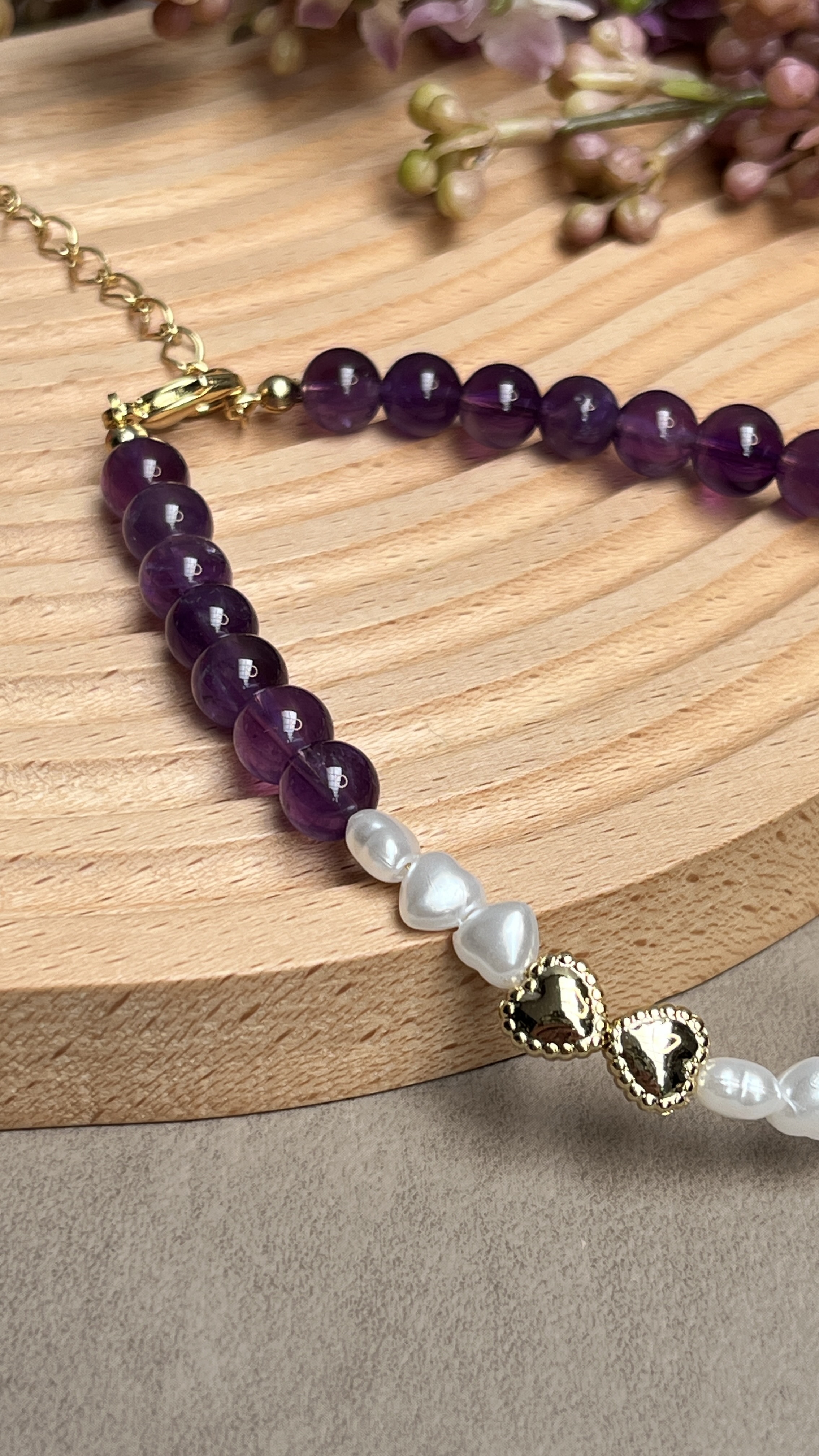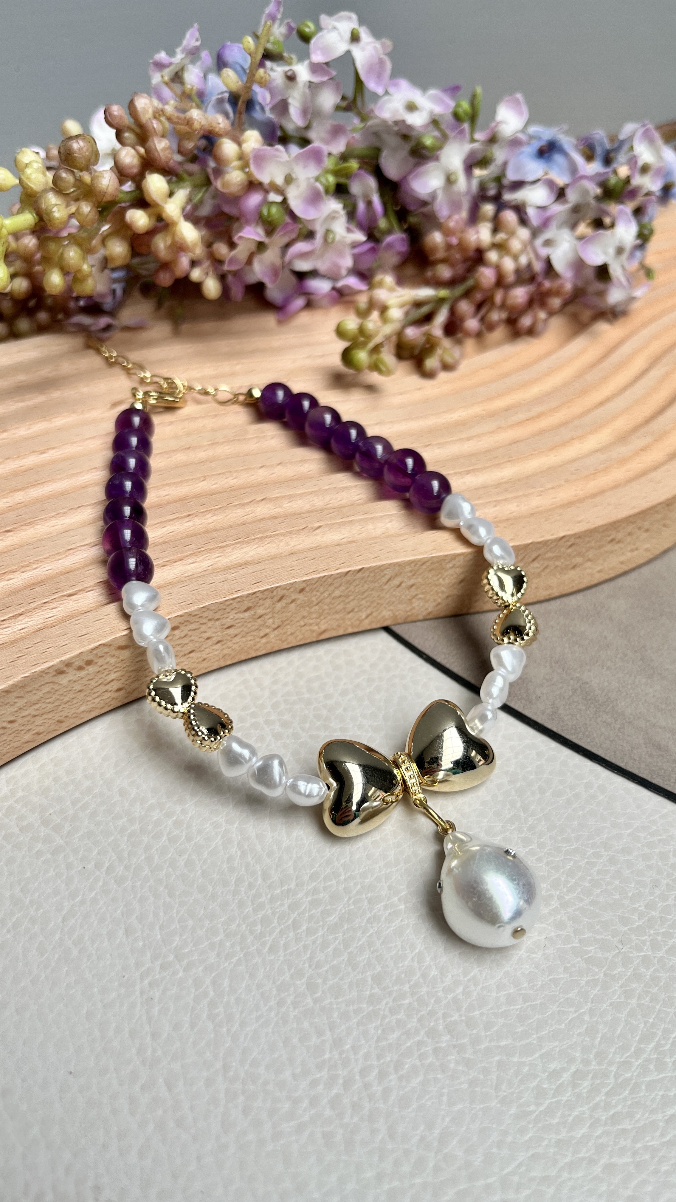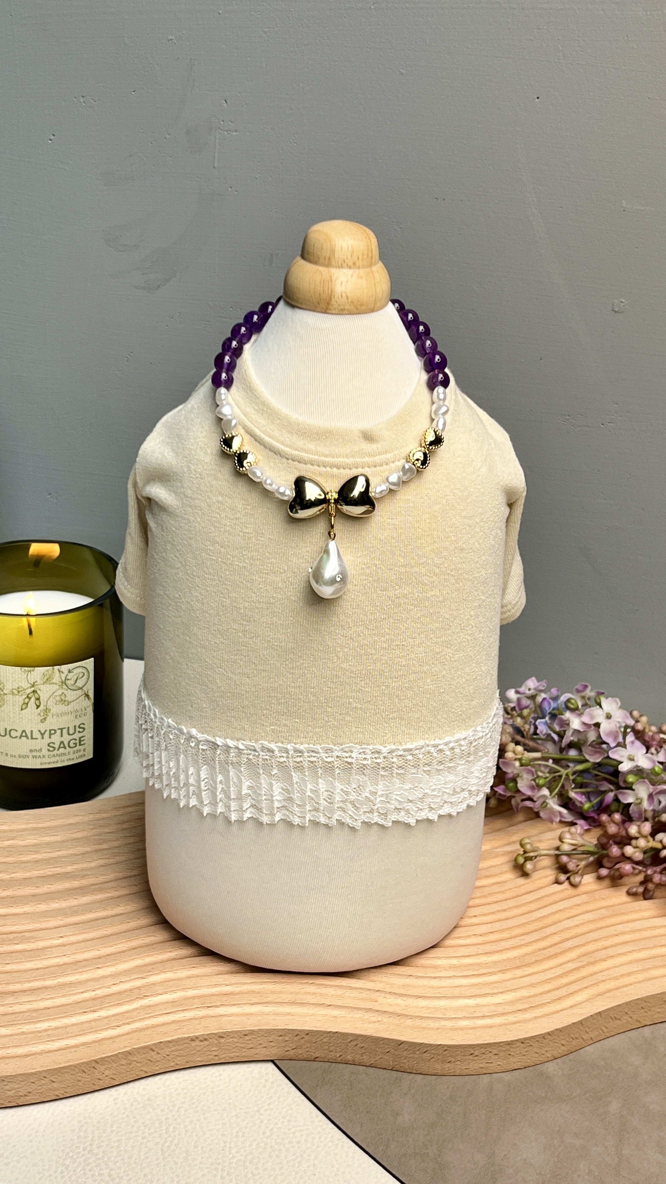 紫水晶與愛心組合成蝴蝶結的特色項鍊,採用貴和製作所在奧地利生產的貴和水晶,加上水滴不規則的珍珠作為主石,紫水晶提供平靜與療癒的效果,適合好動與焦慮的狗狗配戴。