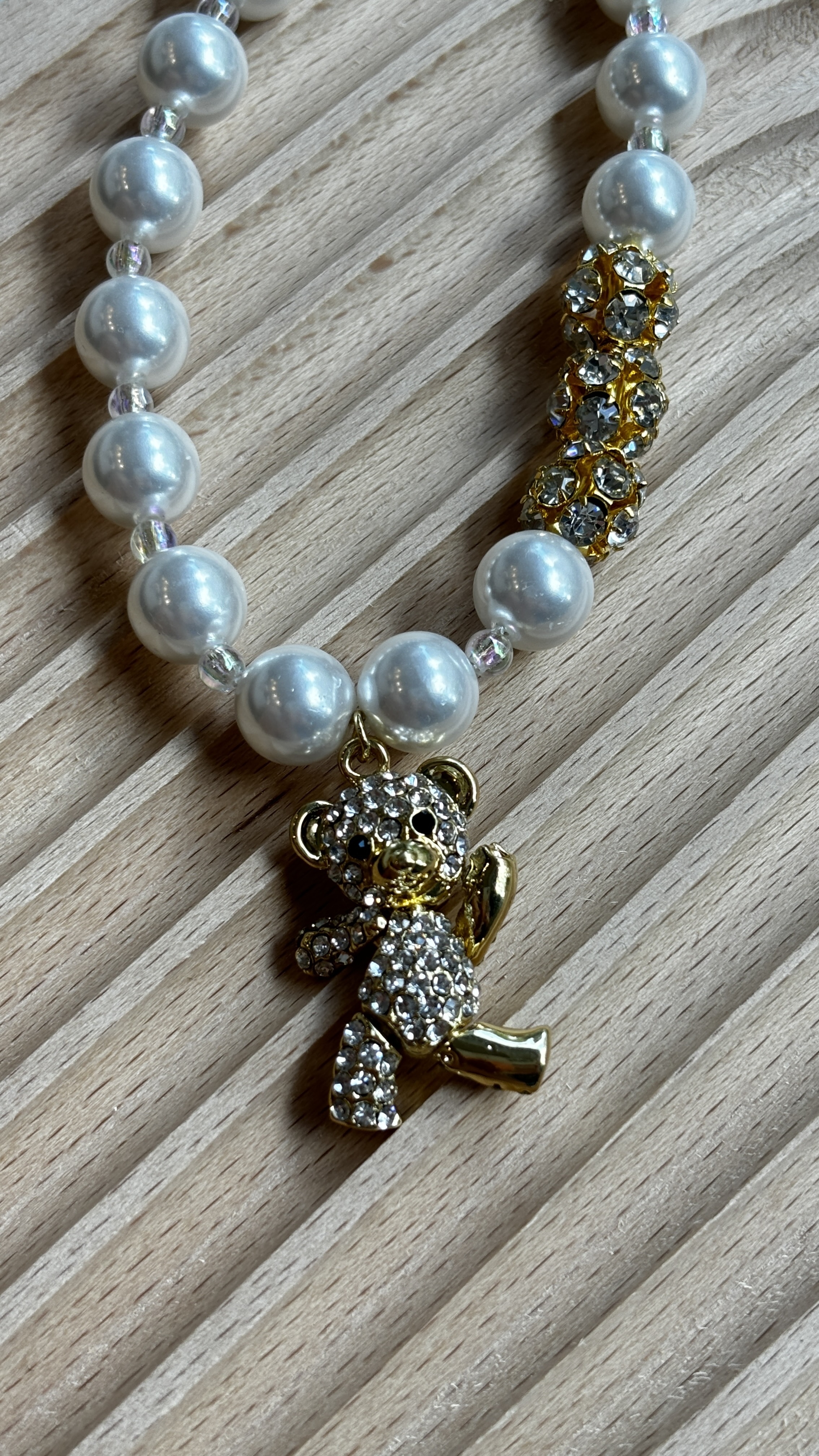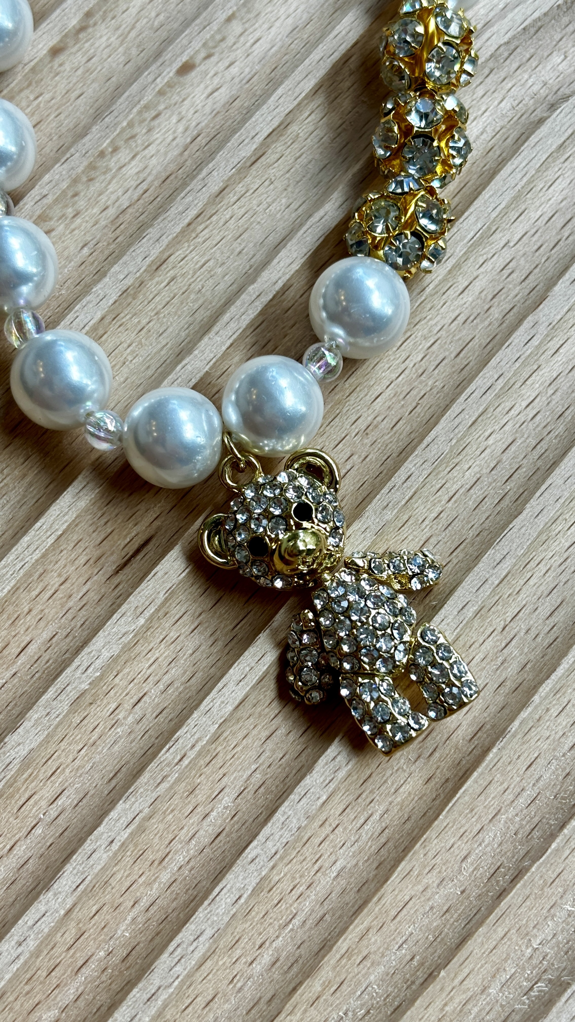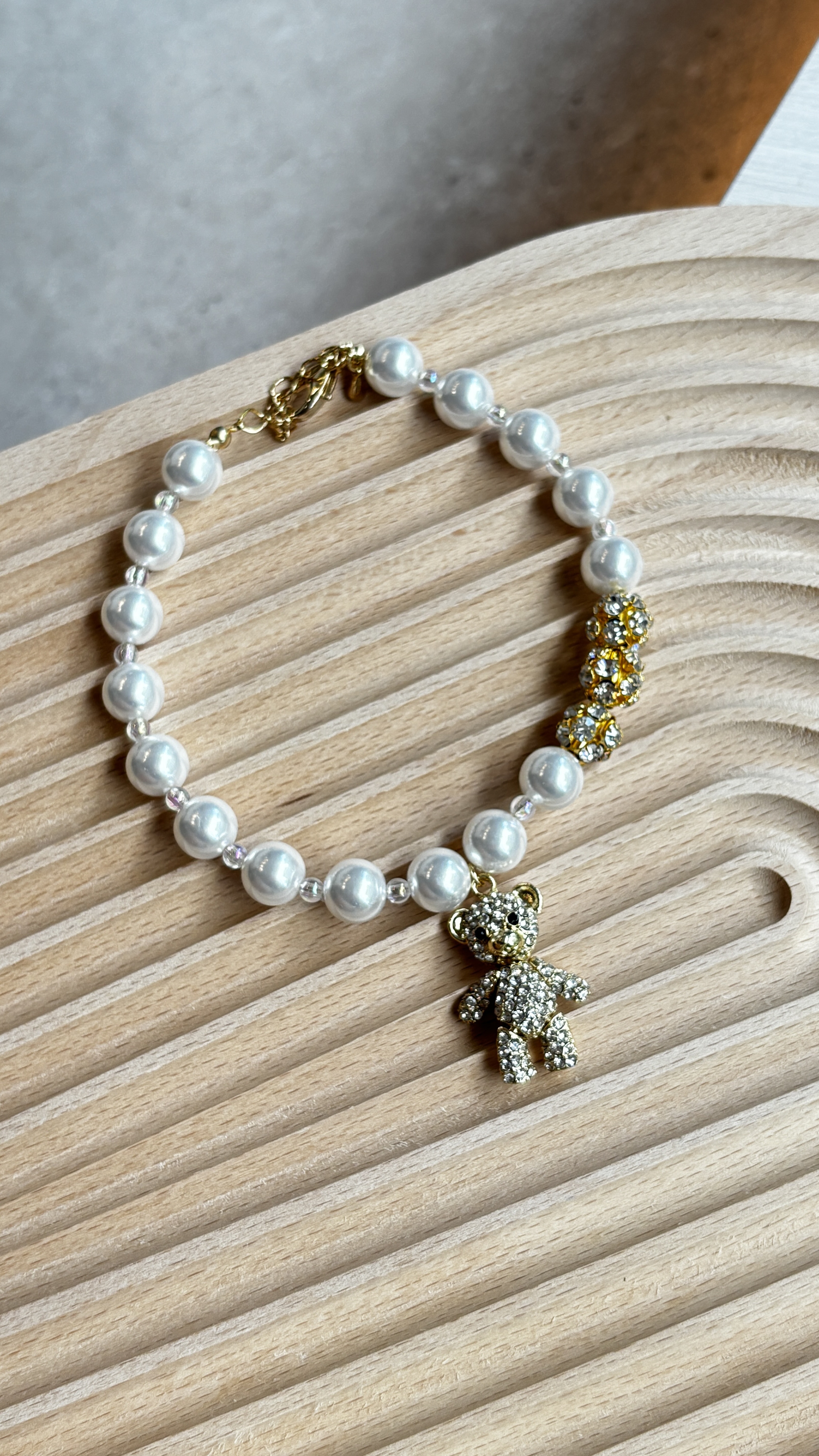 以珍珠搭配可愛小熊綴飾,呈現可愛活潑感。