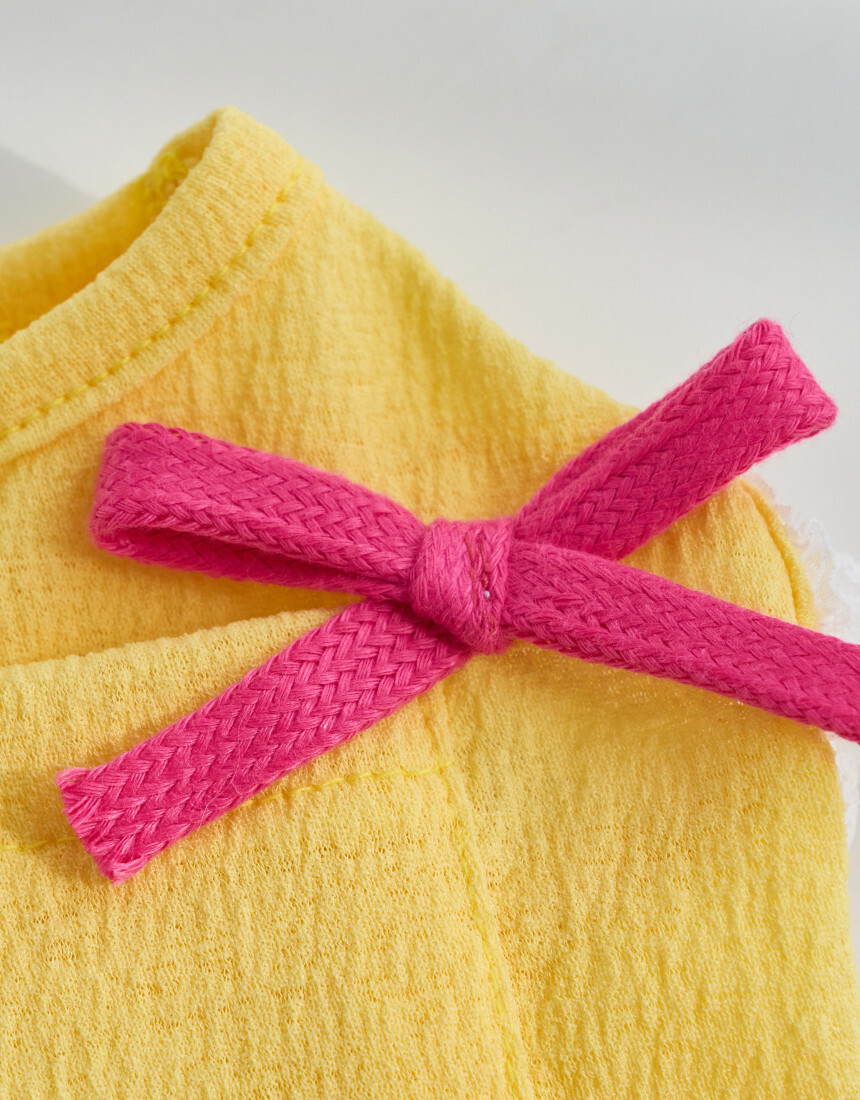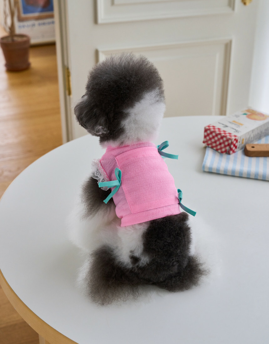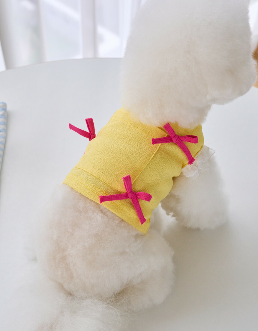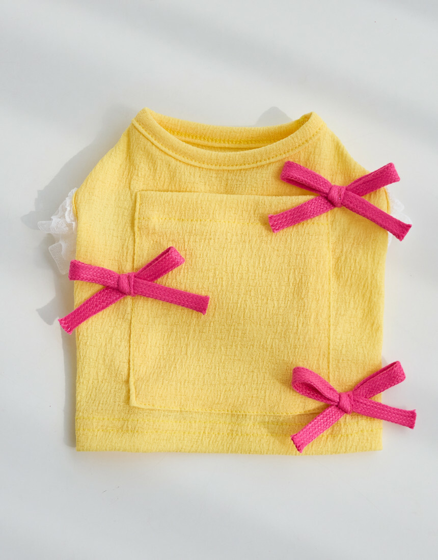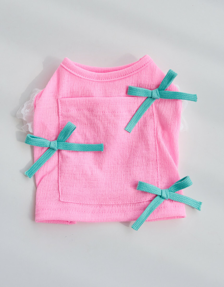 亮麗的多巴胺色調:粉紅/黃/藍色,加上撞色的可愛小蝴蝶結裝飾,無袖與蕾絲滾邊,簡單又細節滿滿的實用款~